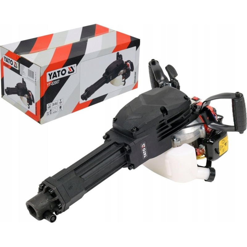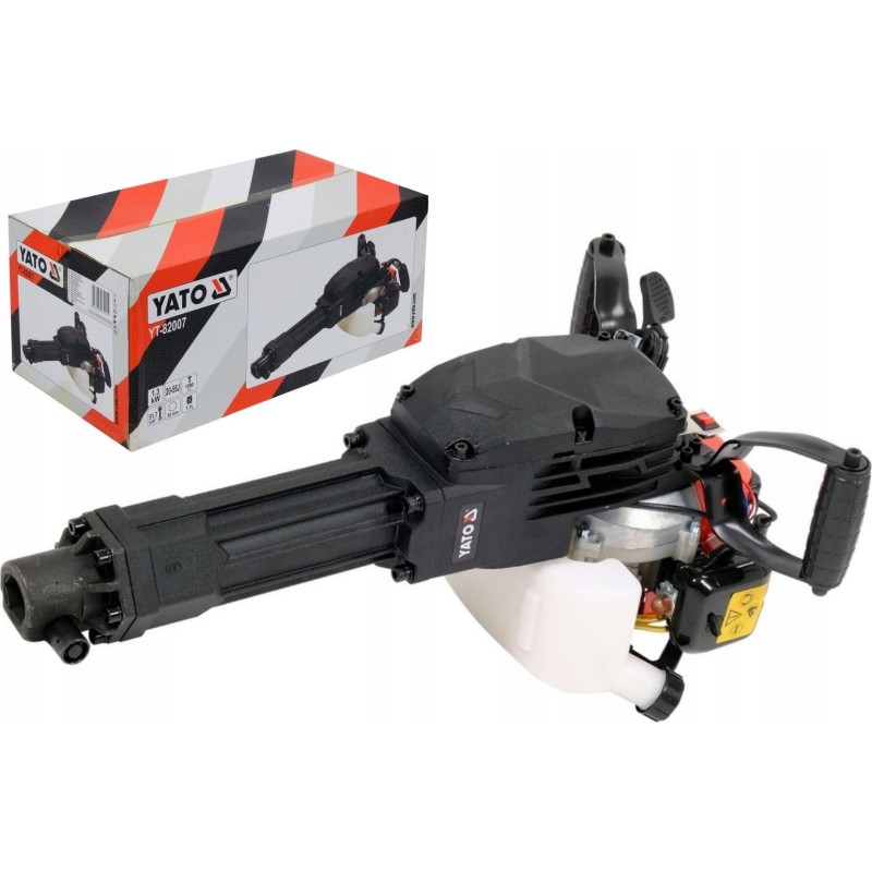 Abbruchhammer mit Zweitakt-Verbrennungsmotor. Das Gerät wiegt 11 kg und lässt sich daher bequem bedienen. Die Schlagkraft von 55 J zerkleinert effizient Stahlbeton, wie er in Fundamenten verwendet wird, sowie Naturstein. Der geringe Kraftstoffverbrauch (0,9 l/h) macht das Gerät sehr wirtschaftlich. Im Gegensatz zu Elektrohämmern sind keine schweren Stromaggregate erforderlich, die mindestens 40 kg wiegen und den Einsatz eines Zweierteams erfordern. Der Hammer YT-82007 kann von einer Person ohne großen Kraftaufwand bedient werden. Neben der Meißelfunktion kann dieser Hammer auch als Stampfer zur Bodenverdichtung eingesetzt werden (passend für 30-mm-Sechskantfuß YT-47385).