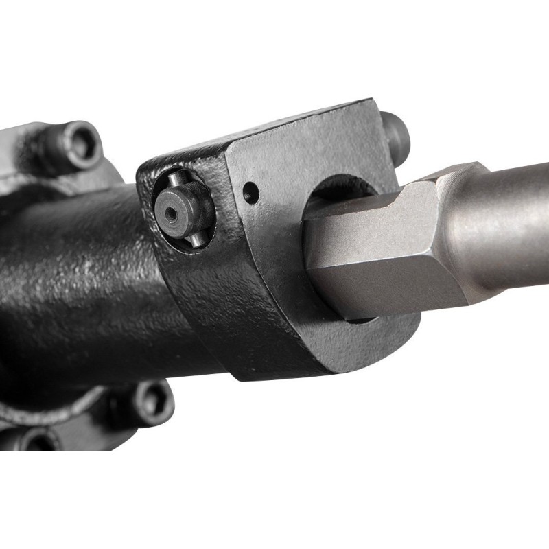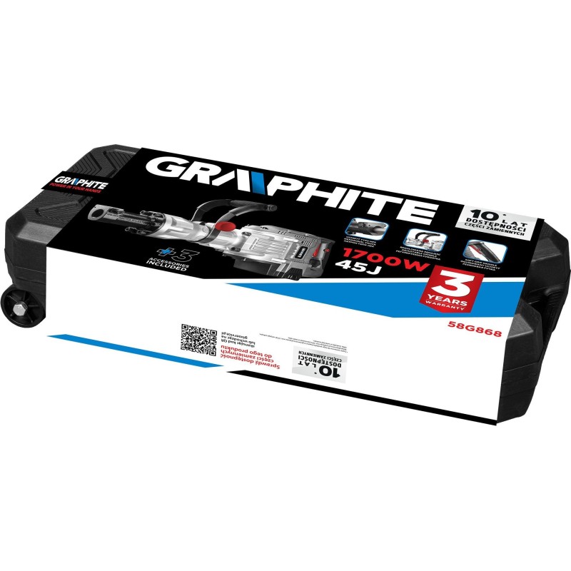 Der Meißelhammer der Marke GRAPHITE zeichnet sich durch eine Schlagenergie von 45 J und eine Frequenz von 1500 Meißelschlägen pro Minute aus. Sein Getriebegehäuse besteht aus einer gegen mechanische Beschädigungen und hohe Temperaturen beständigen Aluminiumlegierung. Die Bedienung des Hammers wird zudem durch einen Vier-Finger-Schalter und eine Sperrfunktion für Dauerbetrieb erleichtert.