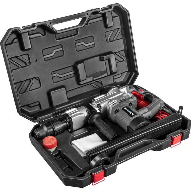 Er verfügt über eine Meißelfunktion und einen Meißel-Indexiermodus. Er ist mit dem SDS-Max-System ausgestattet, das sich durch die Bearbeitung harter Materialien auszeichnet. Der Hammer verfügt über ein 4 Meter langes Netzkabel. Er wird in einem praktischen Koffer mit Zubehörset angeboten: Meißel und Spindelfett. Ein hervorragendes Gerät der Marke Graphite für Profis.