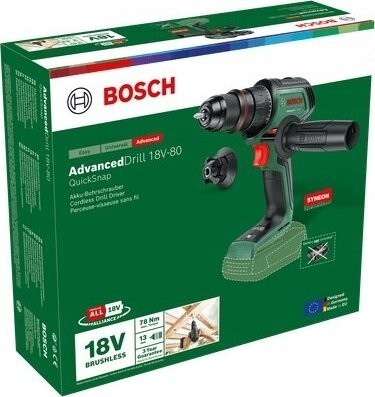 Das Modell Bosch AdvancedDrill 18V-80 vereint leistungsstarkes Bohren und Schrauben mit optimaler Flexibilität. Dank des hohen maximalen Drehmoments von 78 Nm und der Drehzahlregelung lassen sich alle Aufgaben mühelos bewältigen – vom Vorbohren bis zum Eindrehen von Schrauben, Bolzen oder Befestigungselementen in Holz, Metall oder Kunststoff. Dieses robuste Werkzeug mit bürstenlosem Motor und abnehmbarem Metallbohrfutter wurde auf Langlebigkeit ausgelegt. Das 13-mm-Bohrfutter ermöglicht die Aufnahme verschiedener Bohrer und Schraubaufsätze, Lochsägen sowie Zubehörteile. Die Möglichkeit, einen Magnetaufsatz anzubringen, ist bei Schraubarbeiten nützlich, da die Schrauben nicht mit der Hand festgehalten werden müssen. Dieser leistungsstarke Bohrschrauber ist mit einer QuickSnap-Schnittstelle ausgestattet, sodass der Bohrfutter gegen separat erhältliche Adapter ausgetauscht werden kann, um an schwer zugänglichen Stellen zu arbeiten. Der Zusatzgriff sorgt für bessere Kontrolle und Stabilität, was Komfort und weniger Ermüdung bei der Arbeit bedeutet. Die integrierte Bosch Syneon Technology sorgt für optimale Leistung und maximale Laufzeit. Das Elektrowerkzeug ist Teil des 18V POWER FOR ALL-Systems. Ein Akku kann für alle 18V POWER FOR ALL-Elektrowerkzeuge verwendet werden.