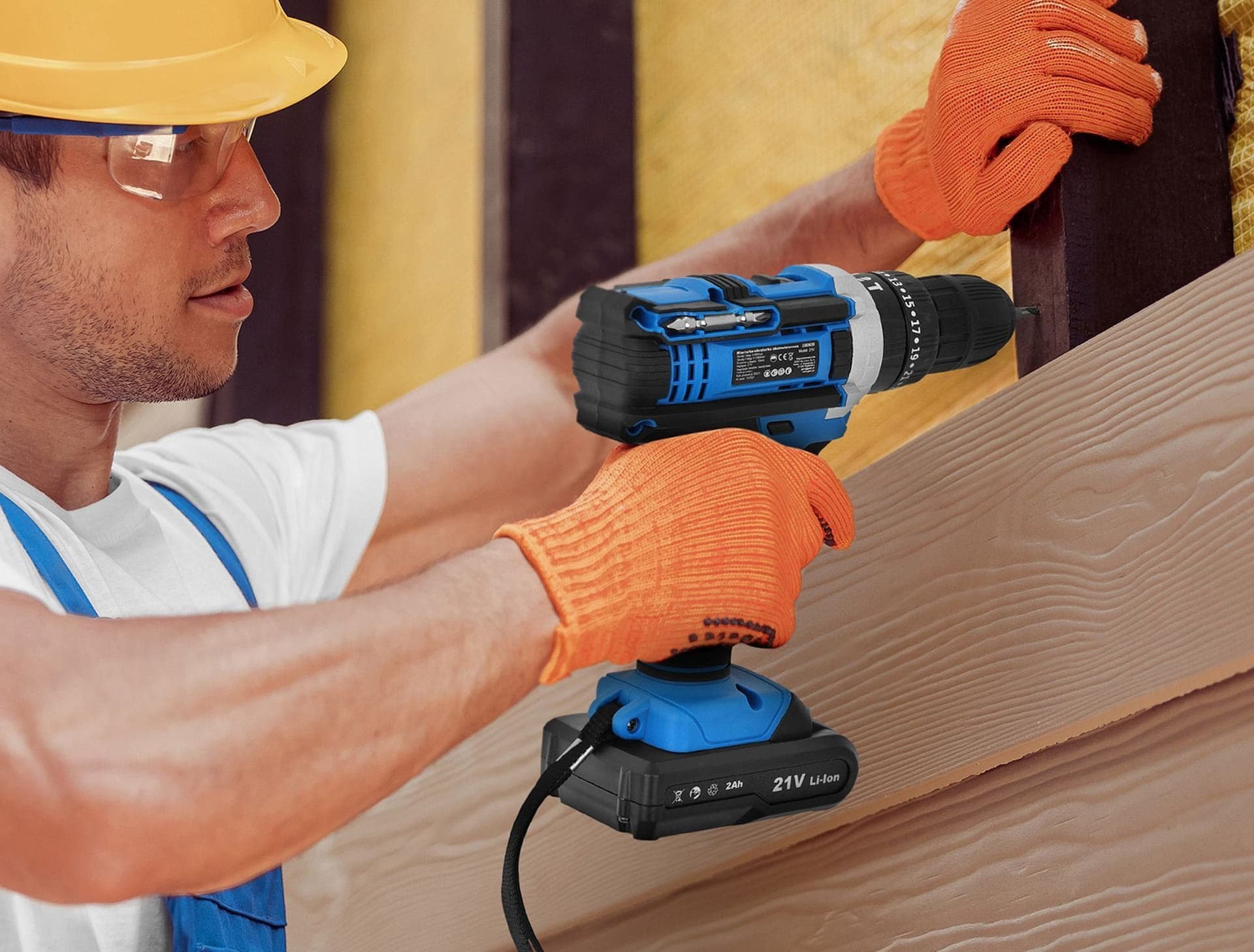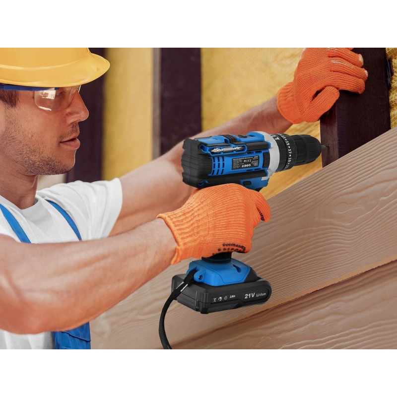 21-V-Akku-Bohrschrauber mit Schlagfunktion. Das Gerät eignet sich ideal zum Bohren in verschiedenen Materialien sowie zum Eindrehen und Herausdrehen von Schrauben, Blechschrauben usw. Im Lieferumfang enthalten sind zwei 2-Ah-Akkus, ein Ladegerät sowie ein praktischer Kunststoffkoffer.