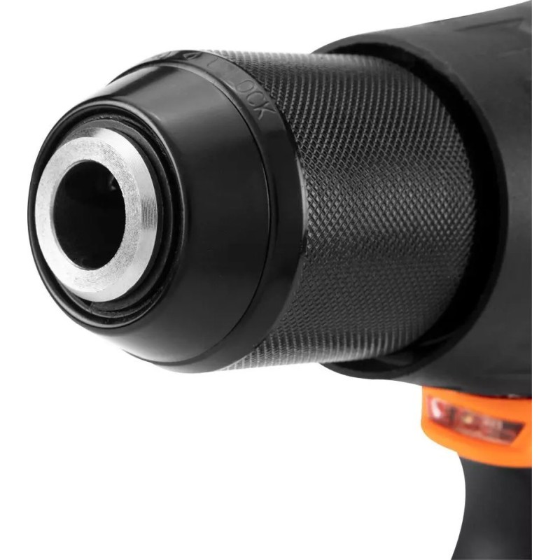 Der Bohrschrauber wurde mit Blick auf Langlebigkeit und Bedienkomfort entwickelt. Der Metallkopf erhöht die Robustheit des Werkzeugs, während die ergonomische Form mit rutschfestem Griff für sicheren Halt und Komfort bei der Arbeit unter schwierigen Bedingungen sorgt. Ein zusätzlicher Griff erleichtert die Kontrolle über das Werkzeug, was besonders bei schwereren Aufgaben nützlich ist. Die integrierte LED-Leuchte beleuchtet automatisch den Arbeitsbereich und ermöglicht präzises Bohren und Schrauben auch an schlecht beleuchteten Stellen.
