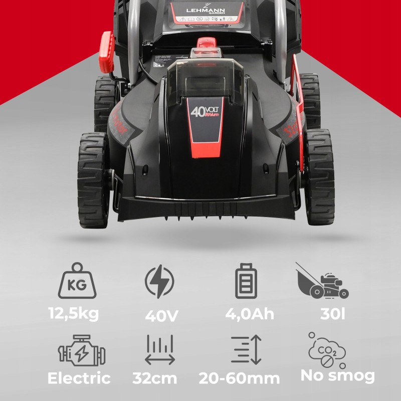 Der Rasenmäher ist mit einem 4-Ah-Akku ausgestattet, der eine Betriebsdauer von bis zu 60 Minuten mit einer einzigen Ladung ermöglicht. Dies ist die ideale Lösung für alle, die bei der Rasenpflege Wert auf Komfort und Zeitersparnis legen.