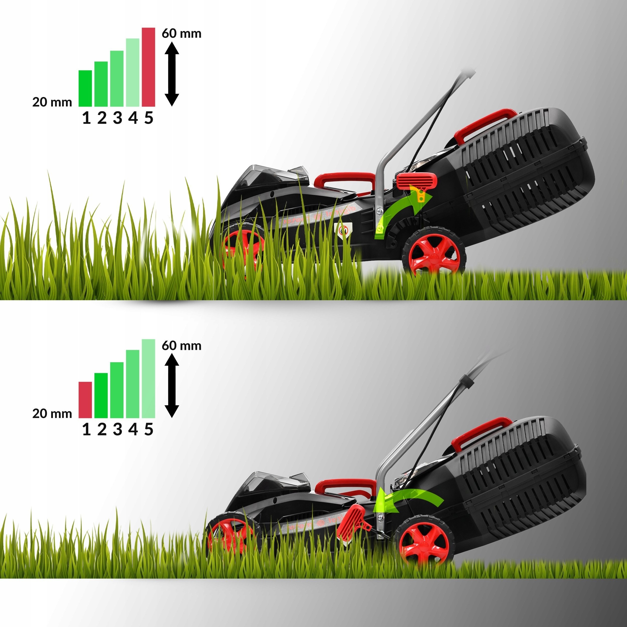 Der Rasenmäher bietet fünf Stufen zur Einstellung der Schnitthöhe im Bereich von 20 bis 60 mm. So können Sie die Grashöhe an Ihre individuellen Bedürfnisse und Vorlieben anpassen.