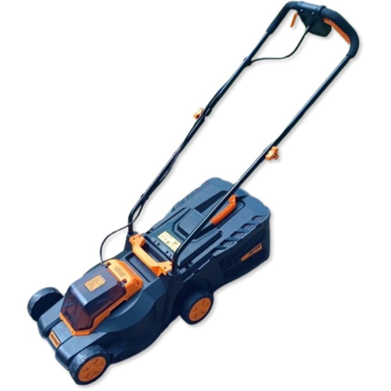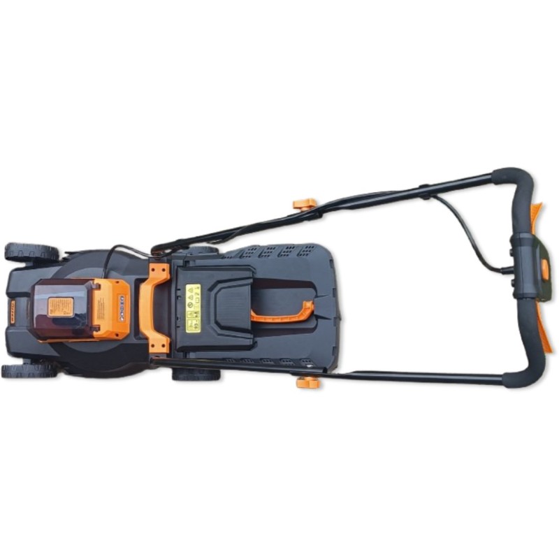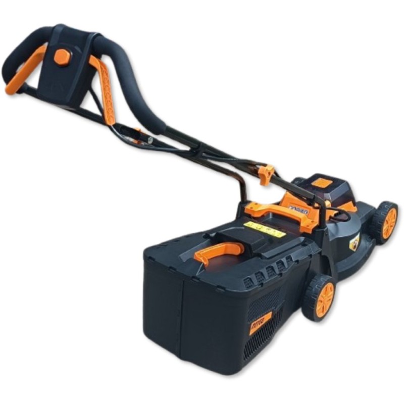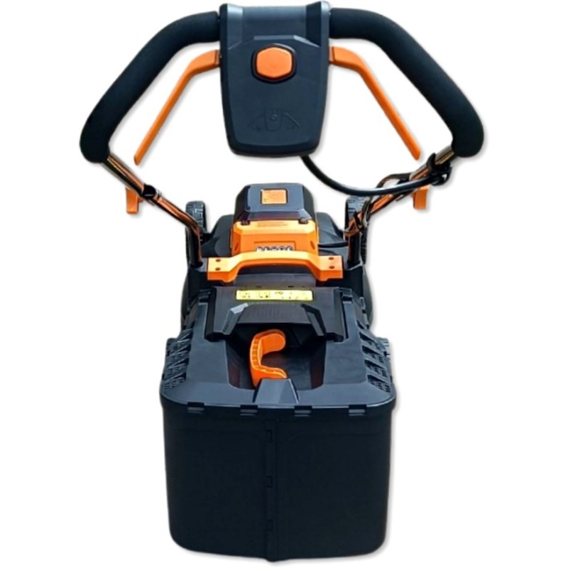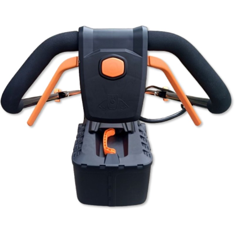 Dieses Modell wiegt nur 8 kg (ohne Akku), wodurch es äußerst wendig ist. Der ergonomische, klappbare Griff mit Ein-/Aus-Schalter und Verriegelung garantiert Komfort und Sicherheit bei der Arbeit und erleichtert zudem die Aufbewahrung des Rasenmähers.