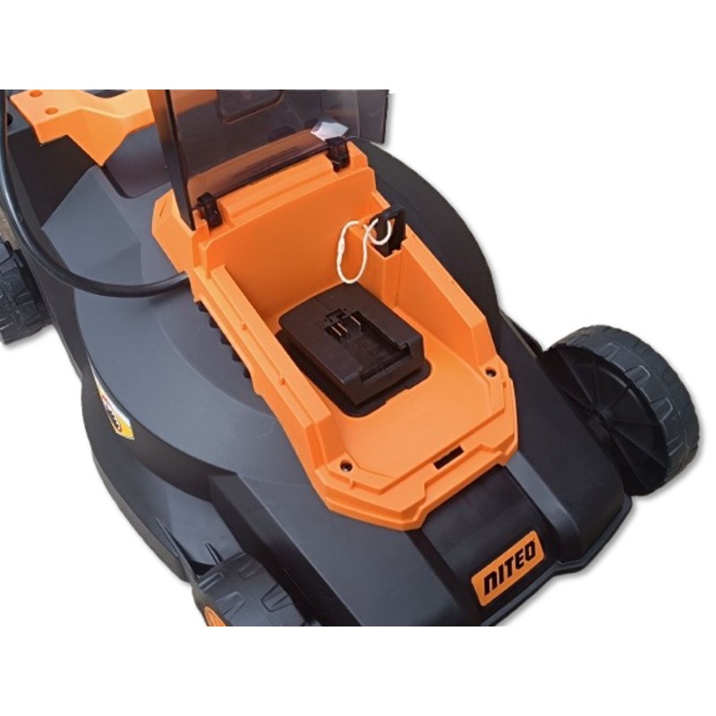 Die Sicherheit bei der Nutzung des NITEO-Rasenmähers wird durch einen Sicherheitsschalter im Akkufach sowie eine Verriegelung gewährleistet, die vor einem versehentlichen Start des Geräts schützt.
