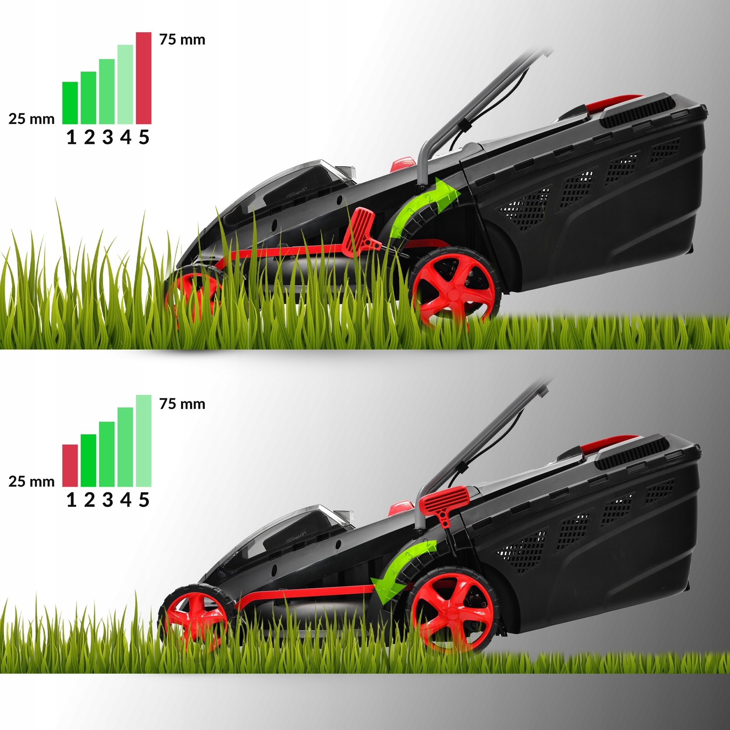 Die Möglichkeit, die Schnitthöhe in fünf Stufen (von 25 bis 75 mm) einzustellen, ermöglicht es, die Arbeit des Rasenmähers an die individuellen Bedürfnisse des Benutzers anzupassen. So erzielen Sie unabhängig von der Grasart ein perfektes Mähergebnis.
