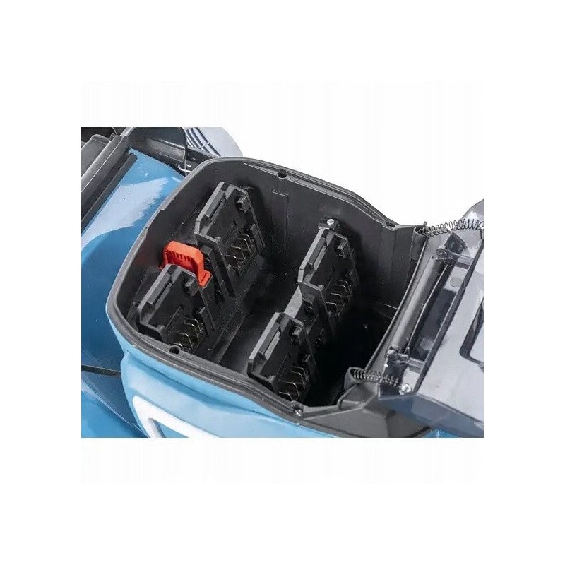 Der Rasenmäher ist mit einem Steckplatz für vier Akkus ausgestattet, was langes Mähen ohne Ladeunterbrechungen ermöglicht. Das automatische Umschaltsystem zwischen den Akku-Paaren sorgt für unterbrechungsfreien Betrieb – wenn ein Akku-Paar leer wird, schaltet das Gerät automatisch auf das nächste um, was die Effizienz und den Bedienkomfort erhöht.