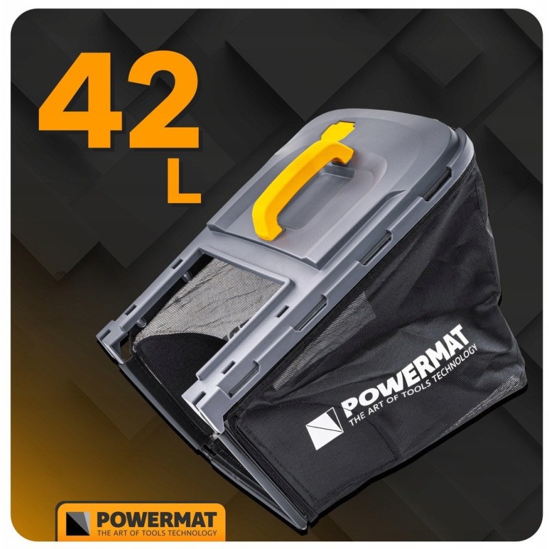 Der Rasenmäher ist mit einem geräumigen Grasfangkorb mit einem Fassungsvermögen von 42 Litern ausgestattet, was ein längeres Arbeiten ohne häufiges Entleeren ermöglicht. Dies erhöht den Bedienkomfort und die Arbeitseffizienz im Garten erheblich.