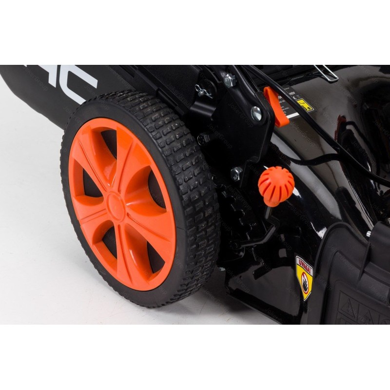 Das Stahlgehäuse aus hochwertigen Materialien sorgt für Langlebigkeit und Widerstandsfähigkeit, und dank der zentralen Höhenverstellung lässt sich die Schnitthöhe mit einem Handgriff bequem ändern – zentral und stufenlos dank eines Federmechanismus.