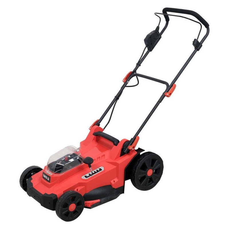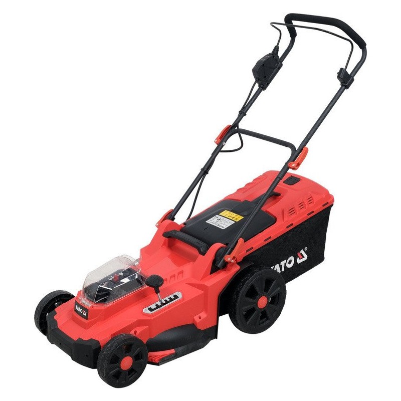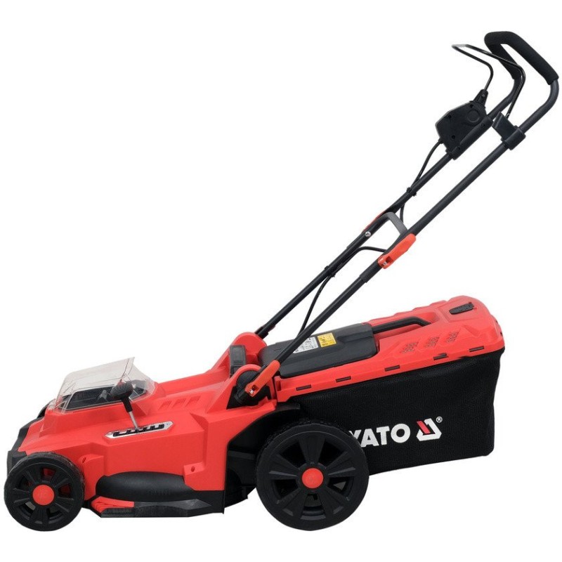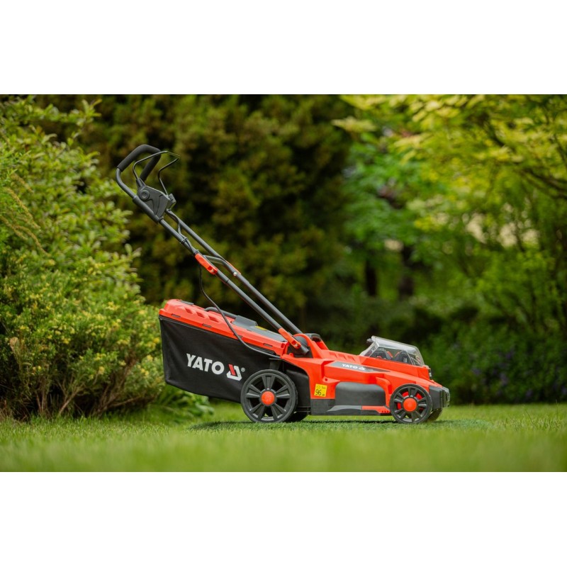 Der Rasenmäher mit doppelter Akkuleistung des YATO-Systems von 36 V sorgt für eine leise und komfortable Rasenpflege. Der Benutzer kann zwischen 3 Höhenstufen für den Griff wählen. Ein weicher Schaumstoff sorgt für einen bequemen Griff. Schnellverschlüsse erleichtern das schnelle Zusammenklappen des Rasenmähers für Transport und Lagerung. Der Rasenmäher kann senkrecht gelagert werden, was zusätzlich Platz spart. Der Schalter am Griff ist mit einer Sperre ausgestattet, die ein versehentliches Einschalten verhindert. Das Gerät arbeitet im ECO-Modus (maximale Batterieschonung) oder im AUTO-Modus (passt die Motordrehzahl an die Belastung an).