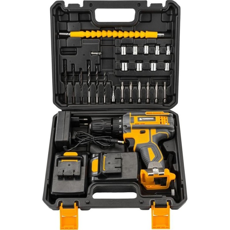 Das gesamte Set wird in einem praktischen Koffer geliefert, der Bits, Bohrer, Steckschlüsseleinsätze und Akkus enthält, was den Transport und die Aufbewahrung erleichtert.