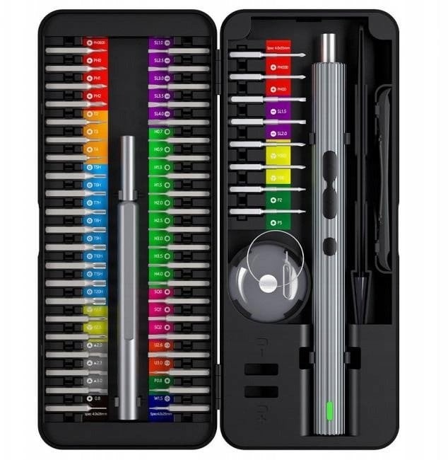 Alle Bits im Set sind nach Farben sortiert, was ein einfaches und schnelles Auffinden ermöglicht. Diese Organisation macht die Arbeit effizienter und angenehmer und beseitigt die Frustration, die mit der Suche nach den richtigen Werkzeugen verbunden ist.