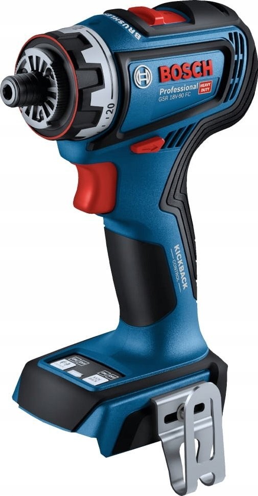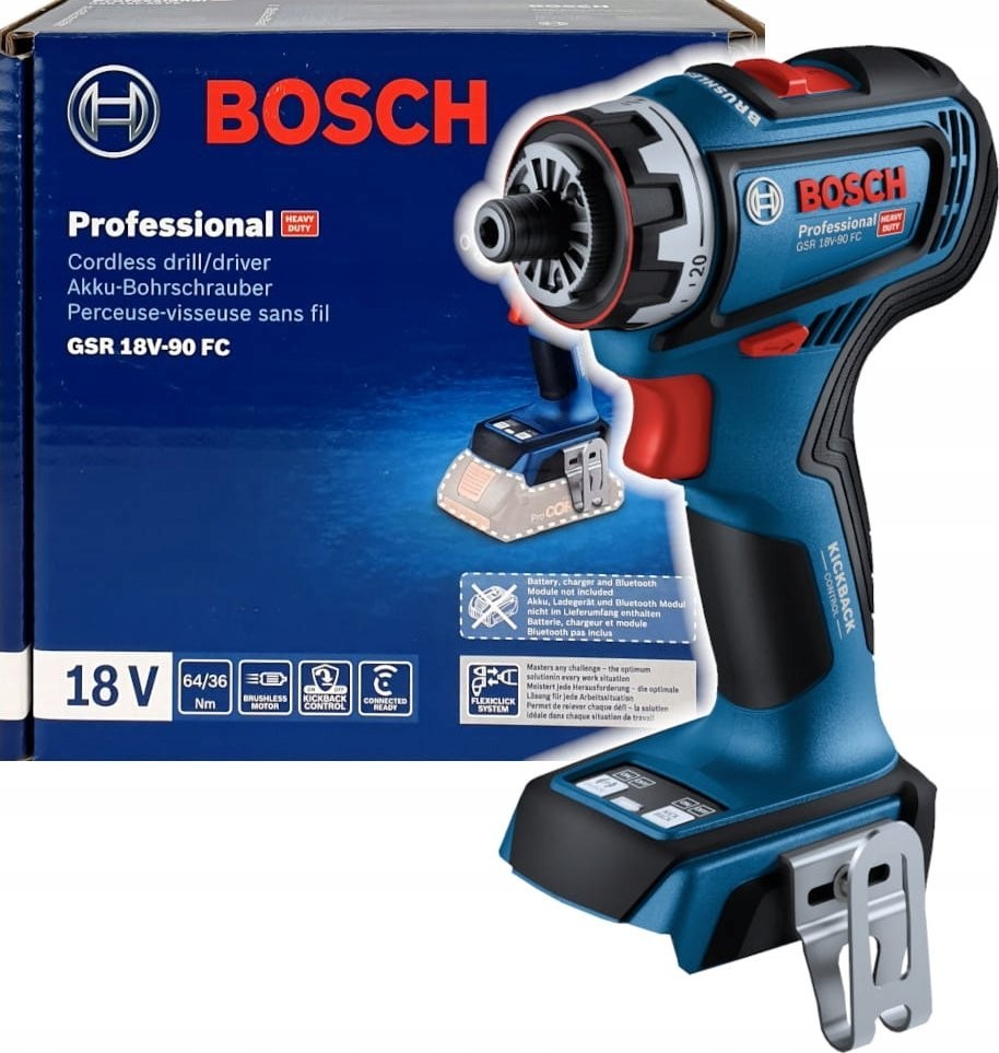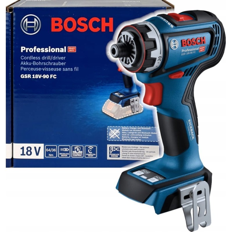 - Das leistungsstarke Modell GSR 18V-90 FC Professional ist Teil des Bosch Professional FlexiClick-Systems, das den Anwender optimal auf alle anfallenden Aufgaben vorbereitet: Der austauschbare Randschraubaufsatz ermöglicht das Arbeiten an Kanten und Wänden, und der austauschbare Winkelaufsatz verwandelt den Bohrschrauber in einen Winkelbohrer