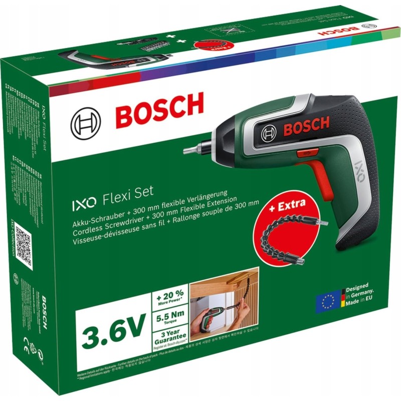 - Artikelname: Bosch Kompakter Akku-Schrauber IXO Flexi-Set (flexibles Schrauben, 7. Gen., 3,6 V / 2,0 Ah, flexibler Schaft und USB-Kabel, max. Biegung 180°, 10 Schraubbits)