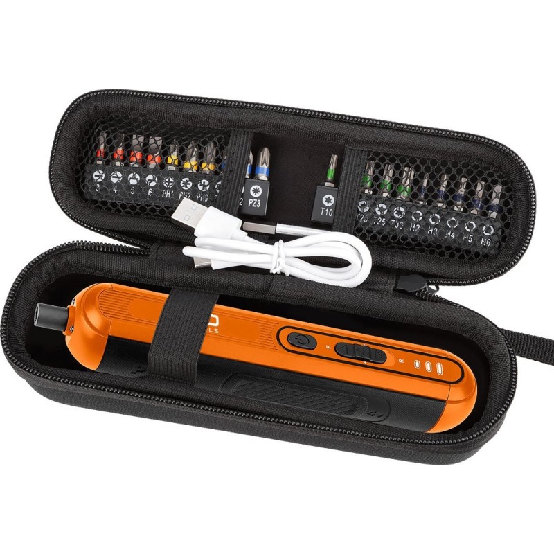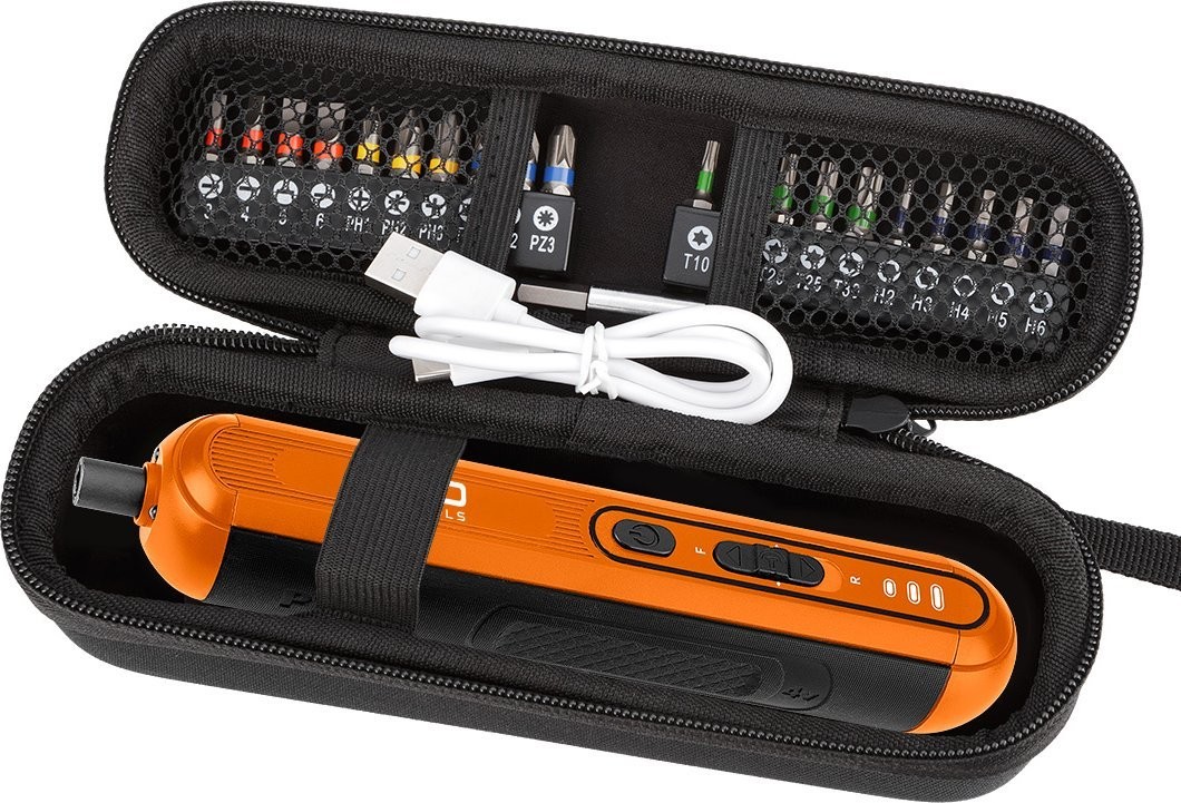 Akku-Schrauber 4 V, Li-Ion, USB-C, Akkukapazität 1500 mAh, Betriebsdauer 55 min, Größe des Arbeitsaufsatzes: Sechskant, Drehzahl: 230/min-1, Drehmoment: (Gang I / II / III): 2 Nm / 3 Nm / 4,5 Nm, Auto-Start/Stopp-System, Spindelarretierung, LED, Ladezustandsanzeige, Schraubbits 25 mm – 20 Stück (SL3, SL4, SL5, SL6, PZ1, PZ2, PZ3, T10, T15, T20, T25, T30, PH1, PH2, PH3, H2, H3, H4, H5, H6), Gewicht 0,23 kg