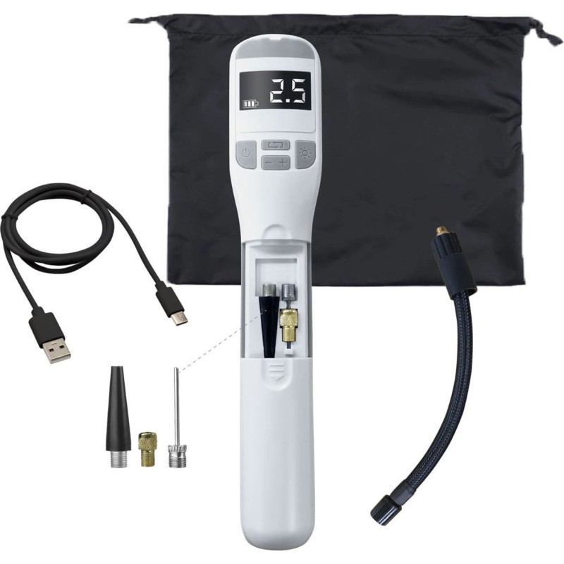Im Lieferumfang enthalten sind zwei Adapter und eine Nadel zum Aufpumpen von Bällen, ein Ladekabel mit Typ-C-Stecker, ein Luftschlauch sowie eine praktische Aufbewahrungstasche.