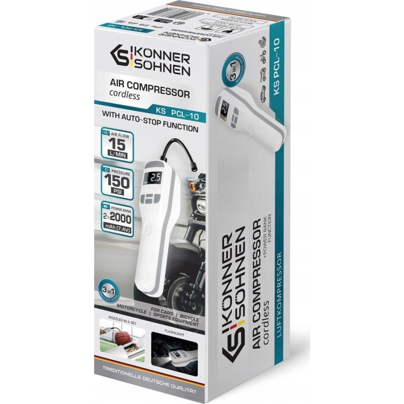 Der Autoluftkompressor KS PCL-10 mit Powerbank-Funktion von Könner & Söhnen® ist nicht nur ein unverzichtbarer Begleiter für Autofahrer, Motorradfahrer und Radfahrer, sondern eignet sich auch ideal zum Aufpumpen von Luftreifen an Kinderwagen, Garten- oder Baugeräten. Er ist unverzichtbar für Besitzer von Sportgeräten, aufblasbaren Spielzeugen, Schwimmwesten und anderen aufblasbaren Gegenständen. Das Aufpumpen erfolgt über den Akku, sodass der Kompressor nicht an eine Stromquelle (Stromnetz oder Autobatterie) angeschlossen werden muss und der gesamte Vorgang nur wenige Minuten dauert. Der Kompressor KS PCL-10 kann mit einer Geschwindigkeit von 15 Litern pro Minute pumpen.