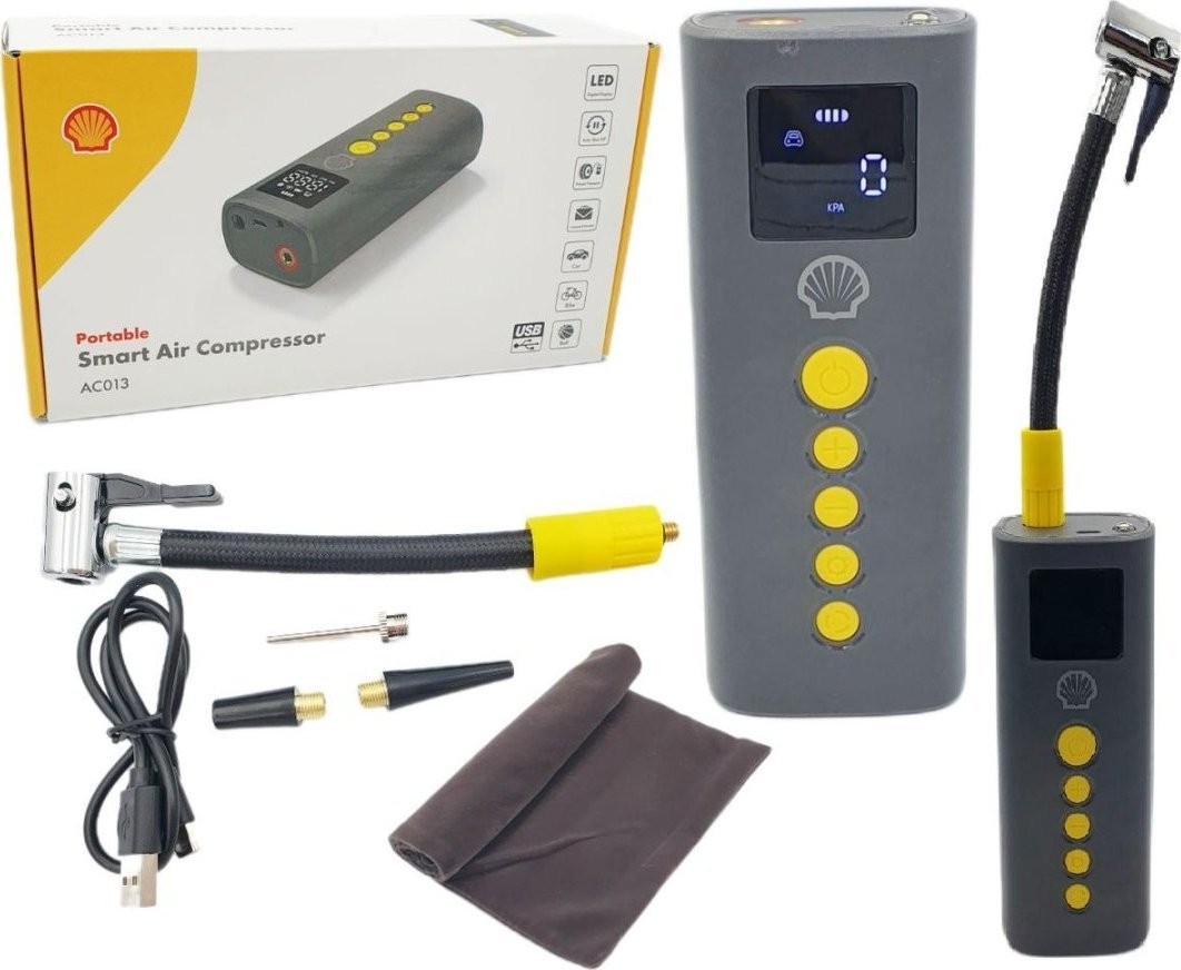 Suchst du einen kompakten, leistungsstarken und benutzerfreundlichen Kompressor? Die Marke Shell hat die perfekte Lösung für dich! Die AKKU-PUMPE REISEKOMPRESSOR USB-AUFLADUNG SHELL ist ein Produkt, mit dem Sie sicher schnell einen Fahrradreifen, einen Autoreifen, eine Luftmatratze oder einen Ball aufpumpen können!