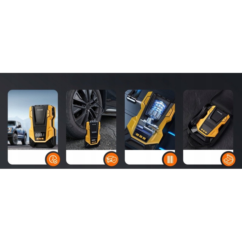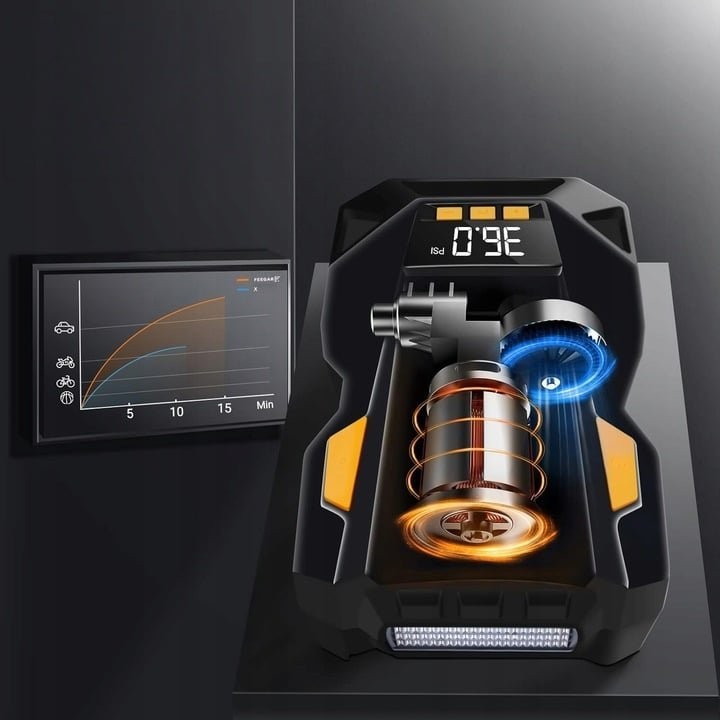 Die Pumpe kann Reifen schnell mit einem maximalen Druck von 150 PSI und einem Luftdurchsatz von 36 l/min aufpumpen. In nur 1 Minute kann die Pumpe einen Reifen von 25 auf 36 PSI aufpumpen und in 5 Minuten einen Autoreifen von 0 auf 36 PSI vollständig aufpumpen. Sie eignet sich ideal zum Aufpumpen von Autos, Motorrädern, Rollern, Fahrrädern, Bällen und anderen aufblasbaren Gegenständen.