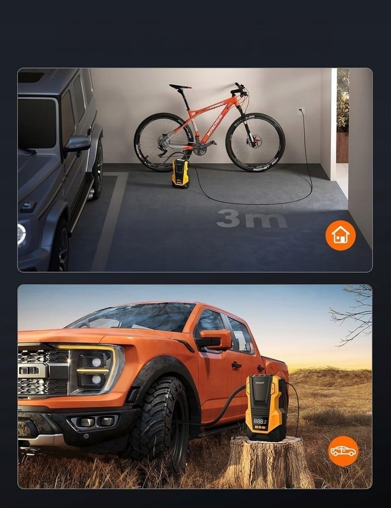 Die Luftpumpe verfügt über eine Doppelstromversorgung, die es ermöglicht, zwischen dem 230-V-Netzbetrieb und dem 12-V-Autostrombetrieb umzuschalten. Dank der AC/DC-Doppelstromversorgung unseres tragbaren Luftkompressors kann dieser sowohl über den Zigarettenanzünder im Auto als auch über eine Steckdose in der Garage mit Strom versorgt werden. So musst du dir unterwegs nie Sorgen machen, dass dir der Strom ausgeht.