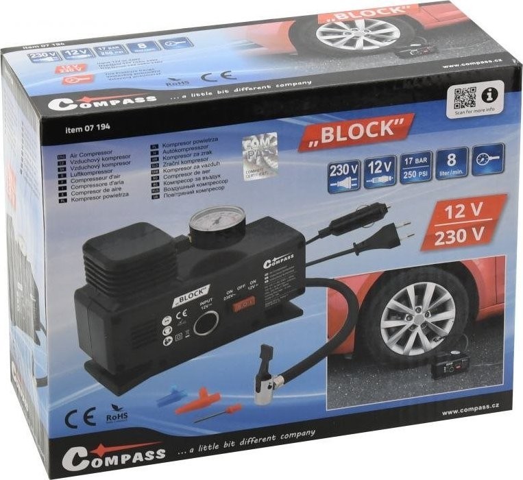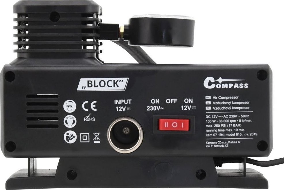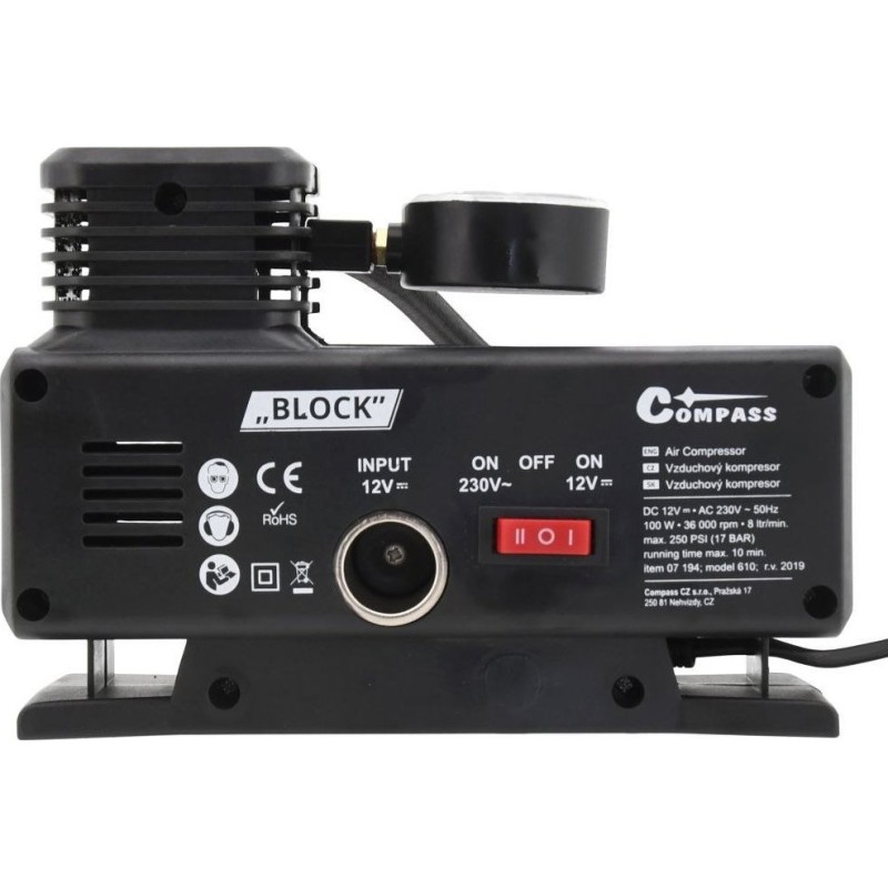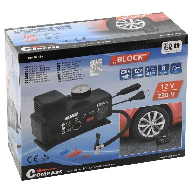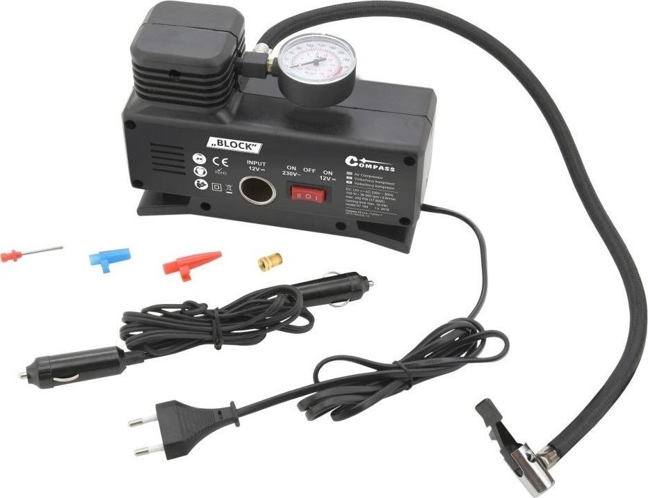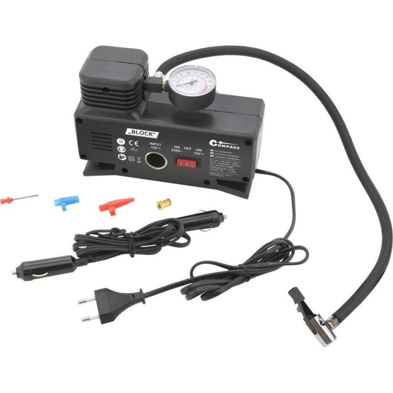 Hochleistungs-Luftkompressor mit 12-V-/230-V-Stromversorgung. Die Stromkabel und die Schläuche zum Aufpumpen sind ausreichend lang: 12 V – 260 cm / 230 V – 150 cm sowie ein Schlauch von 0,5 m. Der Kompressor ist mit einem integrierten Manometer ausgestattet, das den gemessenen Druck in verschiedenen Einheiten anzeigt.
