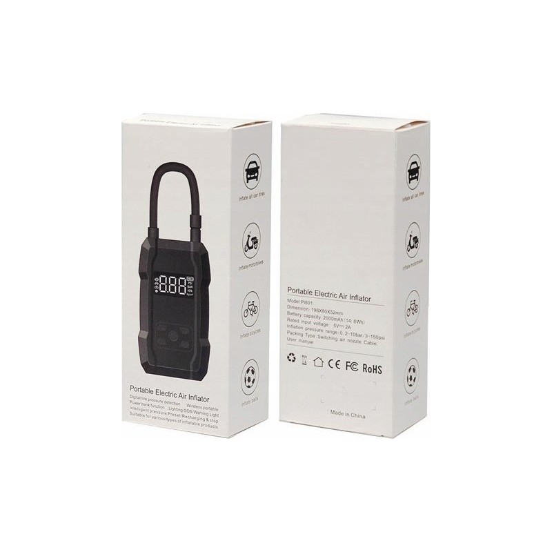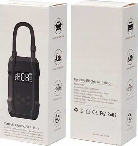 Die tragbare elektrische Luftpumpe WEKOME Pi801 ist ein einfaches und funktionales Gerät, das jeder sportbegeisterte Mensch in seinem Kofferraum haben sollte. Das Gerät ist mit einem Display und Bedientasten ausgestattet, über die der Pumpvorgang gesteuert wird. Auf dem Display kann der aktuelle Reifendruck abgelesen und über die Tasten eingestellt werden. Im multifunktionalen Set sind außerdem Düsen zum Aufpumpen von Bällen, Fahrrädern und Motorrädern enthalten. Darüber hinaus kann diese kleine und sehr funktionale Pumpe auch als Powerbank dienen, sodass Sie den Akku Ihres Smartphones aufladen können. Produktmerkmale:· Material: ABS+PC· Kapazität: 2000 mAh/3,7 V (14,8 Wh)· Druckbereich: 0,2–10,3 bar· Digitalanzeige· Schnittstelle: USB-C· Kompakt, langlebig und tragbar· Automatischer Überhitzungsschutz· Bürstenmotor· Größe: 152 x 104 x 46 mm· Gewicht: 573 g WEKOME Pi801 – Tragbare elektrische Autopumpe + Powerbank 2000 mAh