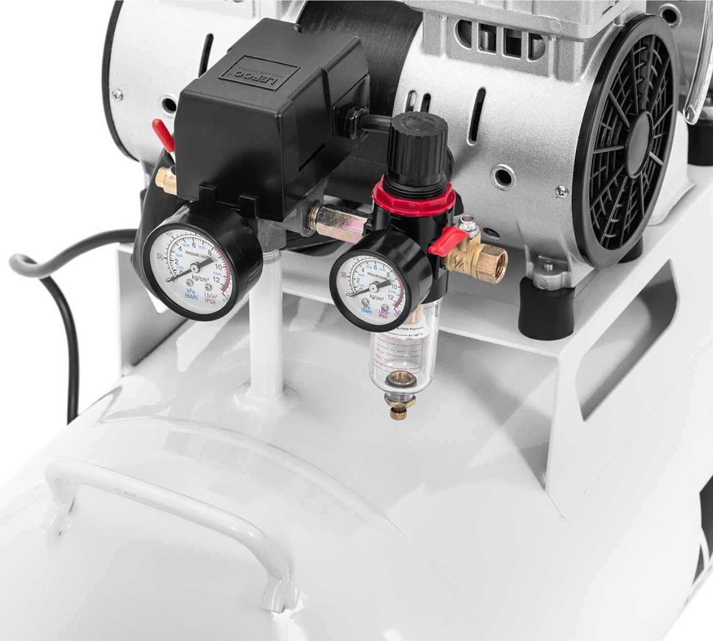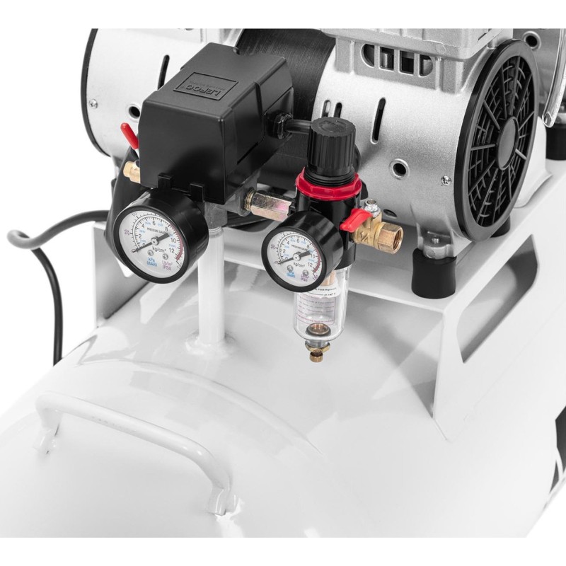 eignet sich für jede Garage oder Werkstatt zum Aufpumpen von Fahrzeugreifen und zum Betrieb von Druckluftwerkzeugen. Der große Tank sorgt für eine kontinuierliche Versorgung mit Druckluft, deren Druck zuverlässig auf einem optimalen Niveau gehalten wird. Das bedeutet, dass er auch einen zuverlässigen Antrieb für Druckluftwerkzeuge gewährleistet. Der Kompressor ist mit einem Griff und großen Rädern ausgestattet, wodurch er leicht zu transportieren ist. Der Tank des Kompressors hat ein Fassungsvermögen
