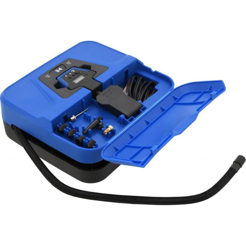 Die Adapter eignen sich zum Aufpumpen von Bällen, Luftmatratzen oder Schwimmbecken. Im Lieferumfang sind 4 Ersatzdüsen für das automatische Absperrventil enthalten – diese Funktion sorgt dafür, dass der Kompressor den Reifen auf den eingestellten Druck aufpumpt und sich anschließend automatisch abschaltet. Das integrierte, abnehmbare Reifendruckmessgerät zeigt den gemessenen Druck in verschiedenen Einheiten an. Die integrierte 9-LED-Taschenlampe eignet sich zur Beleuchtung des Arbeitsbereichs. Lesen Sie vor der Verwendung die beiliegende Anleitung sorgfältig durch. Technische Daten: Produktabmessungen: 22,5 x 21,5 x 9 cm Stromversorgung: DC 12 V Maximale Stromaufnahme: 8 A Maximaler Druck: 7,5 kg/cm² (BAR); 110 psi Durchfluss: 40 l/min Max. Betriebszeit: 20 min Taschenlampe: 9x LED Schlauchlänge: ca. 40 cm Länge des Netzkabels: 280 cm Lieferumfang: 1 x Kompressor