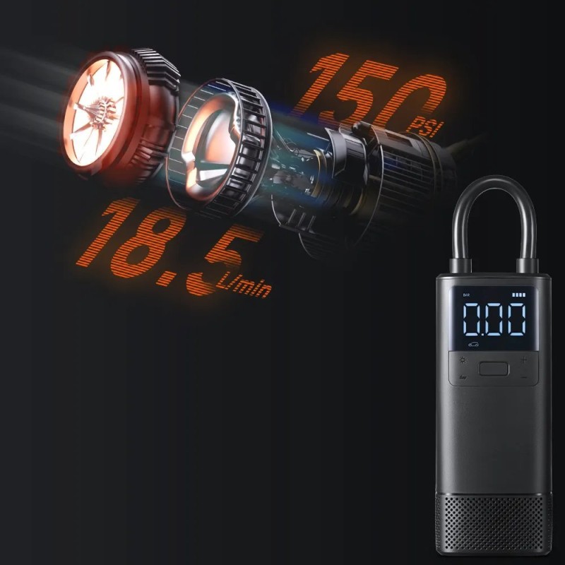 Dank optimierter, vollständig aus Metall gefertigter Zylinder und Getriebe ist der kabellose Luftkompressor 70mai TP05 robust genug, um einen maximalen Druck von 150 PSI zu erreichen und Fahrrad- und Autoreifen mühelos aufzupumpen.