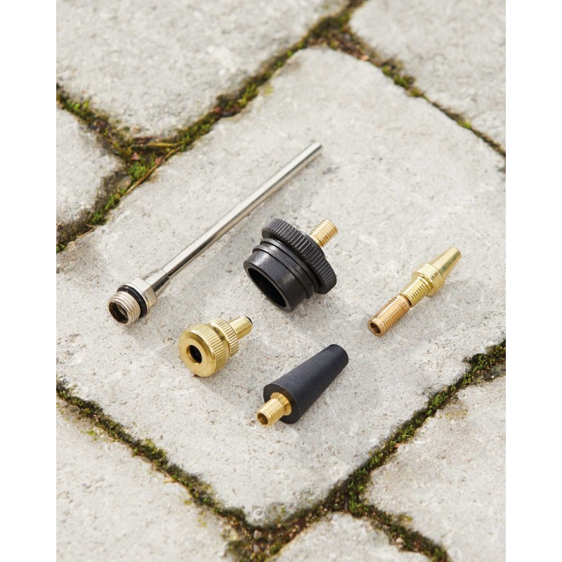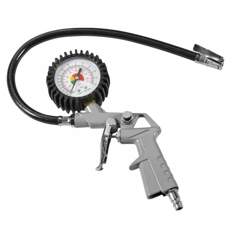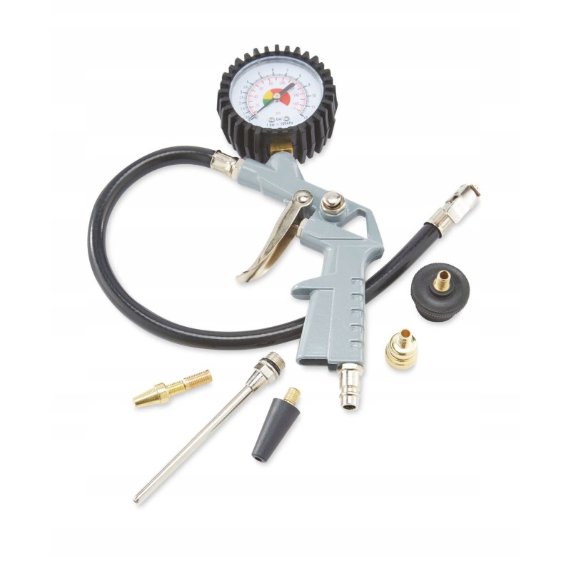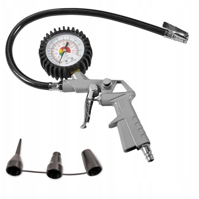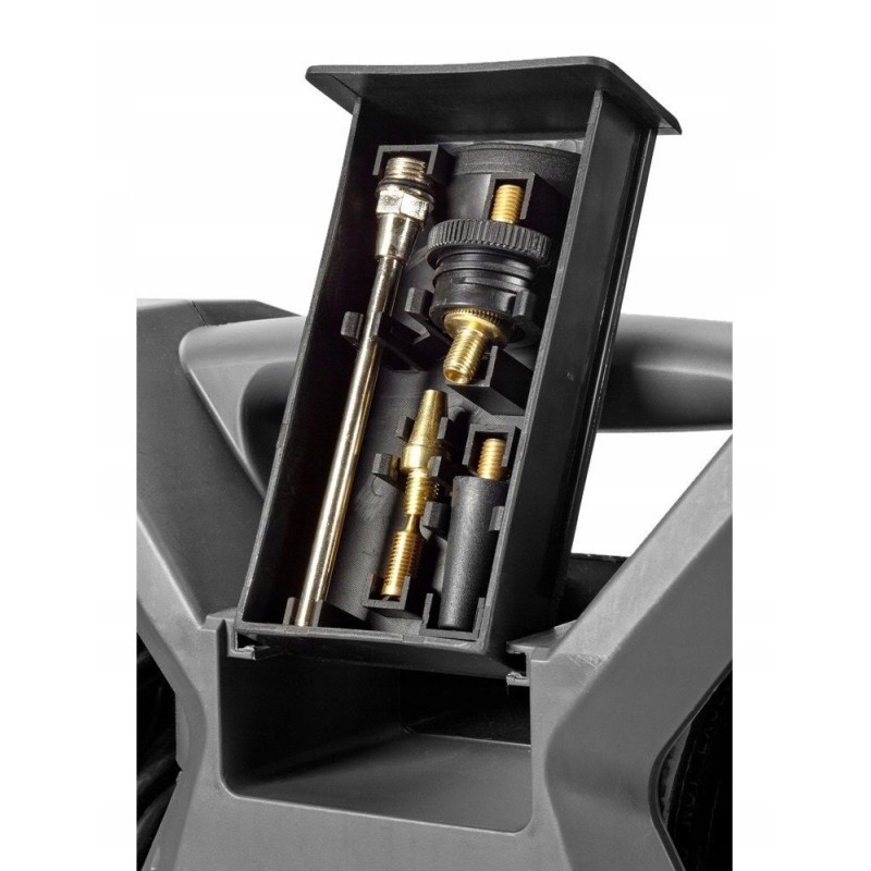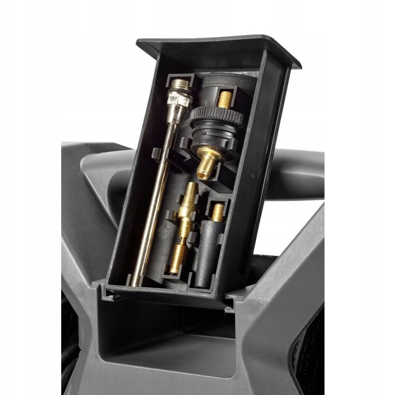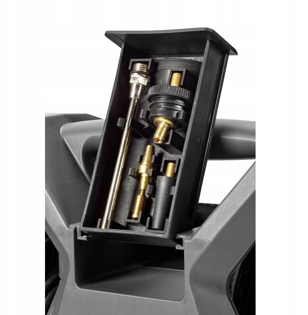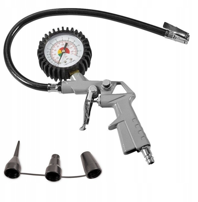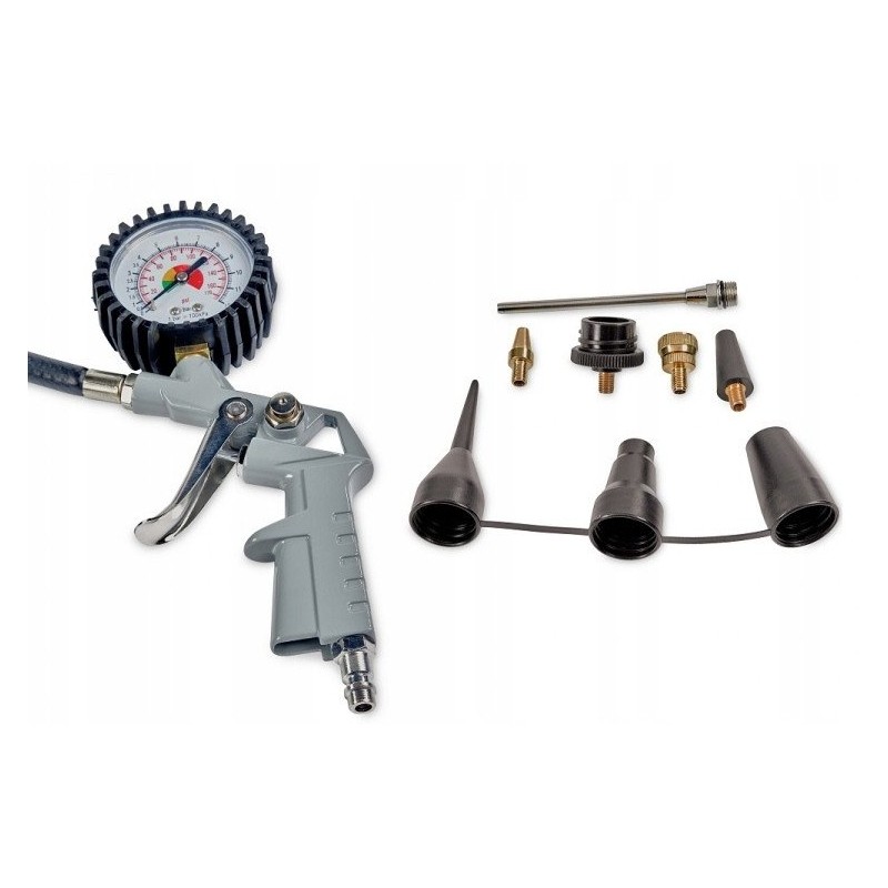 Der Kompressor verfügt über einen integrierten 3 m langen Druckschlauch, einen Satz Aufsteckdüsen zum Aufpumpen sowie eine 2-in-1-Pistole – zum Aufpumpen mit Manometer und nach dem Wechseln der im Lieferumfang enthaltenen Düse zum Ausblasen.