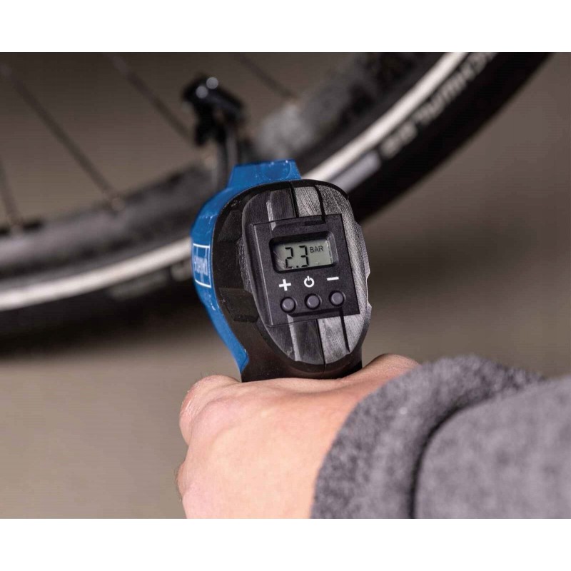 Das LCD-Display zeigt den aktuellen und den eingestellten Arbeitsdruck in bar oder PSI an.