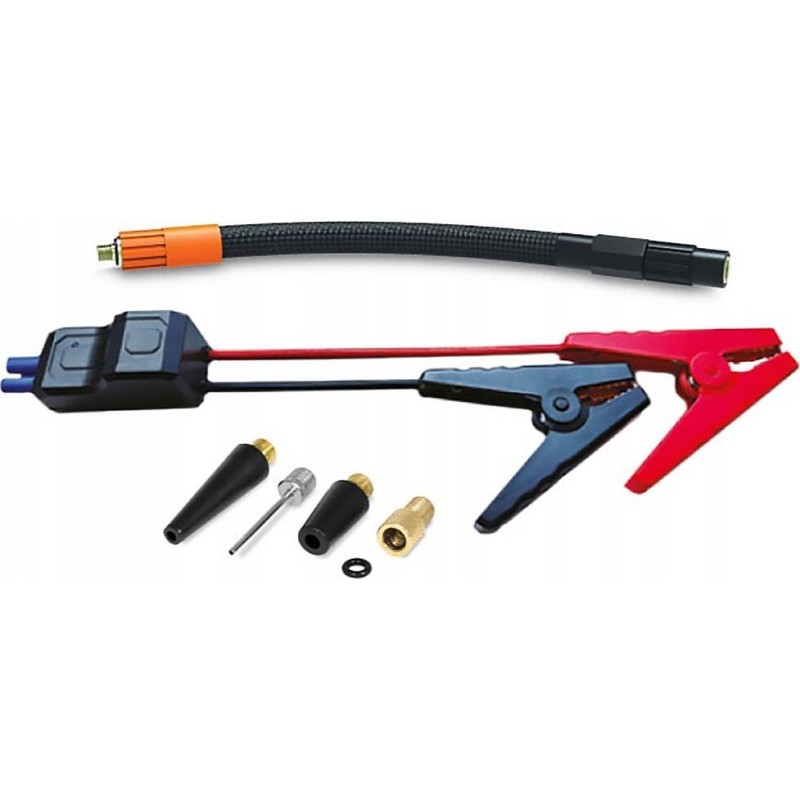 - Zubehör: 4 Ventiladapter, Tasche, USB-Kabel, Starthilfekabel, Kompressor, Ladegerät, Hochdruckschlauch