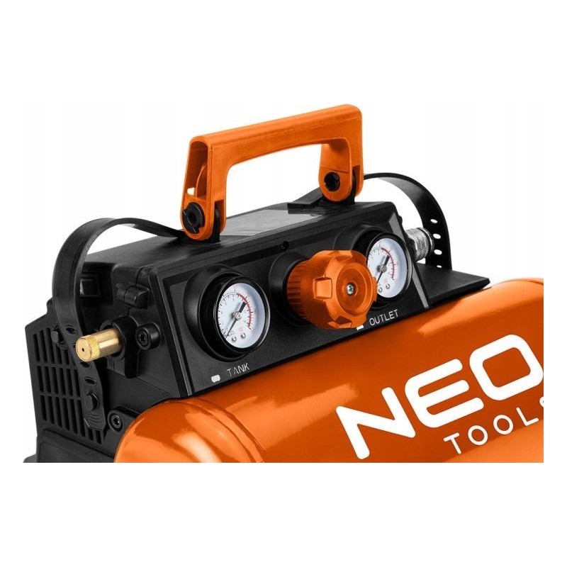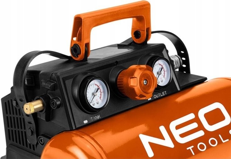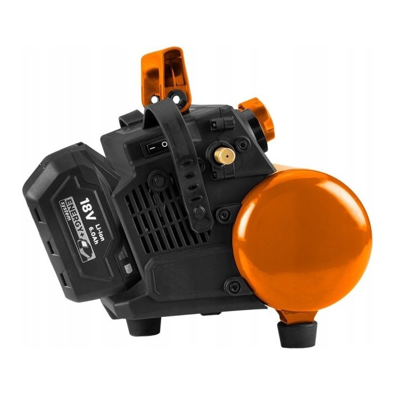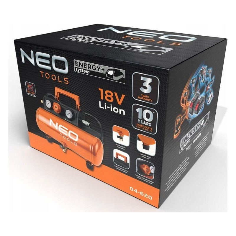 Er zeichnet sich durch ein Tankvolumen von 3,8 l, einen maximalen Druck von 8 bar und eine Leistung von 14 l/Minute aus. Der NEO-Kompressor wird zum Aufpumpen, zur Entfernung von Verschmutzungen und zur Versorgung kleiner Druckluftwerkzeuge empfohlen.