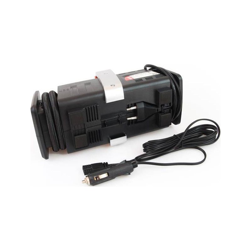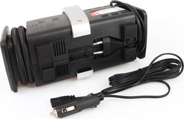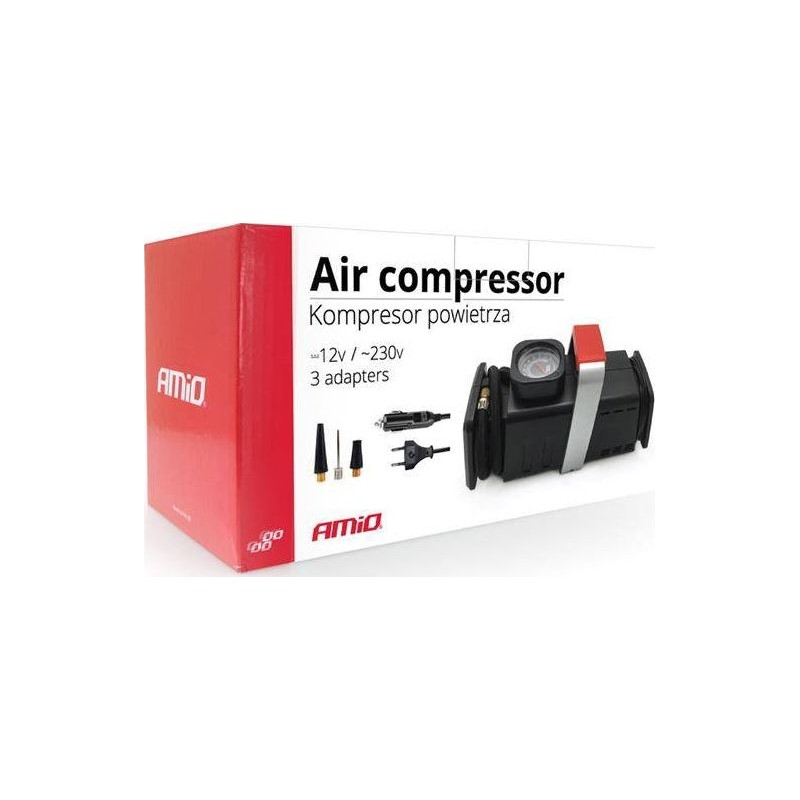 Robuster Kompressor der polnischen Marke AMIO mit hoher Leistung und großer Zuverlässigkeit. Sein Hauptmerkmal ist die Möglichkeit, ihn sowohl an den 12-V-Zigarettenanzünder im Auto als auch an eine 230-V-Steckdose zu Hause anzuschließen. Er verfügt über einen ca. 55 cm langen Druckschlauch mit einem Gewindeanschluss für Autoreifenventile. Die Gewindeanschlussnippel verhindert, dass der Schlauch während des Pumpvorgangs herunterfällt. Er ist mit einem eingebauten Manometer mit einer Skalierung bis 7 bar (100 psi), einem Tragegriff für bequemen Transport sowie speziellen Aufwickelvorrichtungen für die Kabel ausgestattet, was die Aufbewahrung erleichtert und das Erscheinungsbild des Kompressors verbessert, sowie mit einem Schalter unterhalb des Tragegriffs.