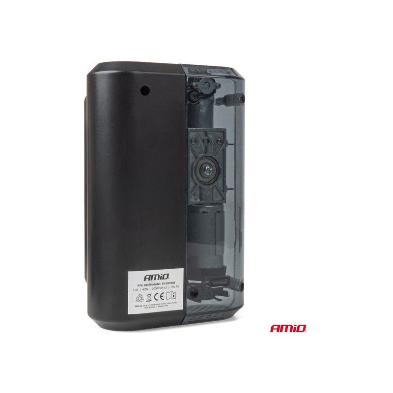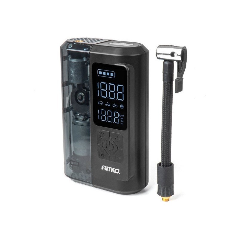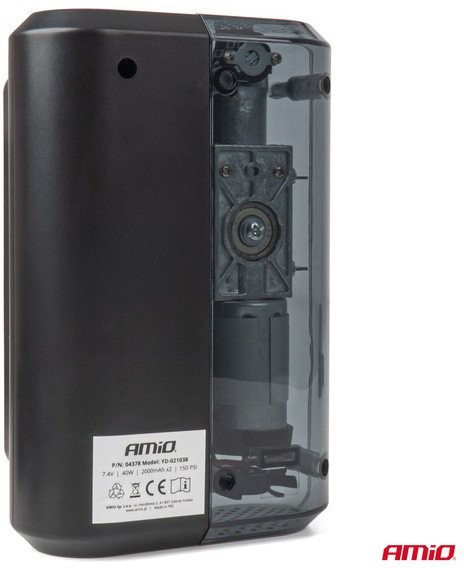 Der Kompressor AMIO-04378 zeichnet sich durch sein kabelloses Design aus, das volle Bewegungsfreiheit gewährleistet. Dank des Akkus mit einer Kapazität von 2 × 2000 mAh bietet das Gerät eine lange Betriebsdauer, ohne dass ein Anschluss an eine externe Stromquelle erforderlich ist. Der flexible 16 cm lange Schlauch erleichtert die Handhabung und ermöglicht das bequeme Aufpumpen von Reifen, Bällen und anderen Gegenständen.