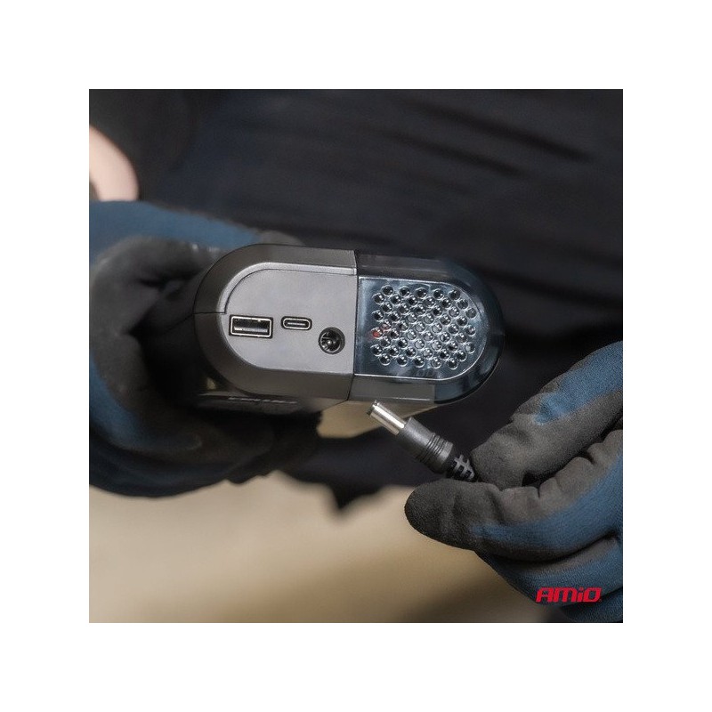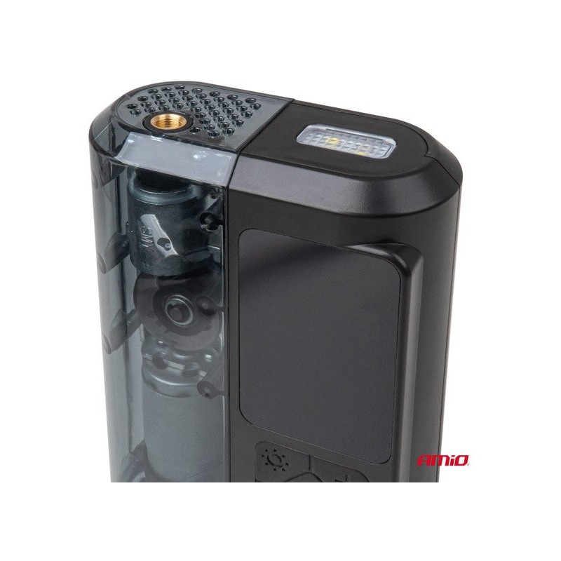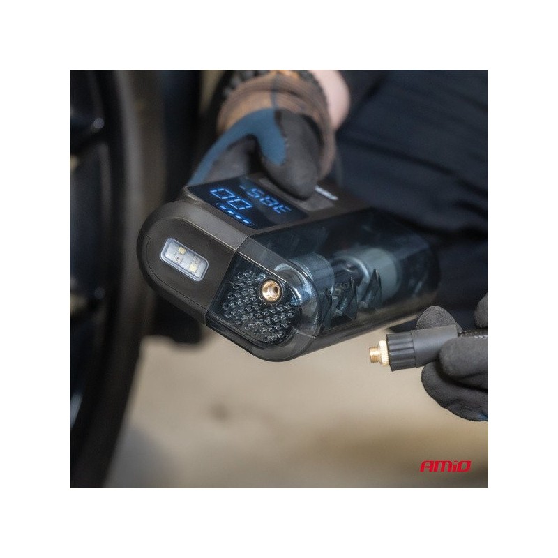 Der Kompressor AMIO-04378 ist mit einer praktischen LED-Taschenlampe ausgestattet, die die Nutzung des Geräts nach Einbruch der Dunkelheit erleichtert. Dies ist die ideale Lösung für Personen, die häufig nachts unterwegs sind oder unter schwierigen Bedingungen Beleuchtung benötigen.
