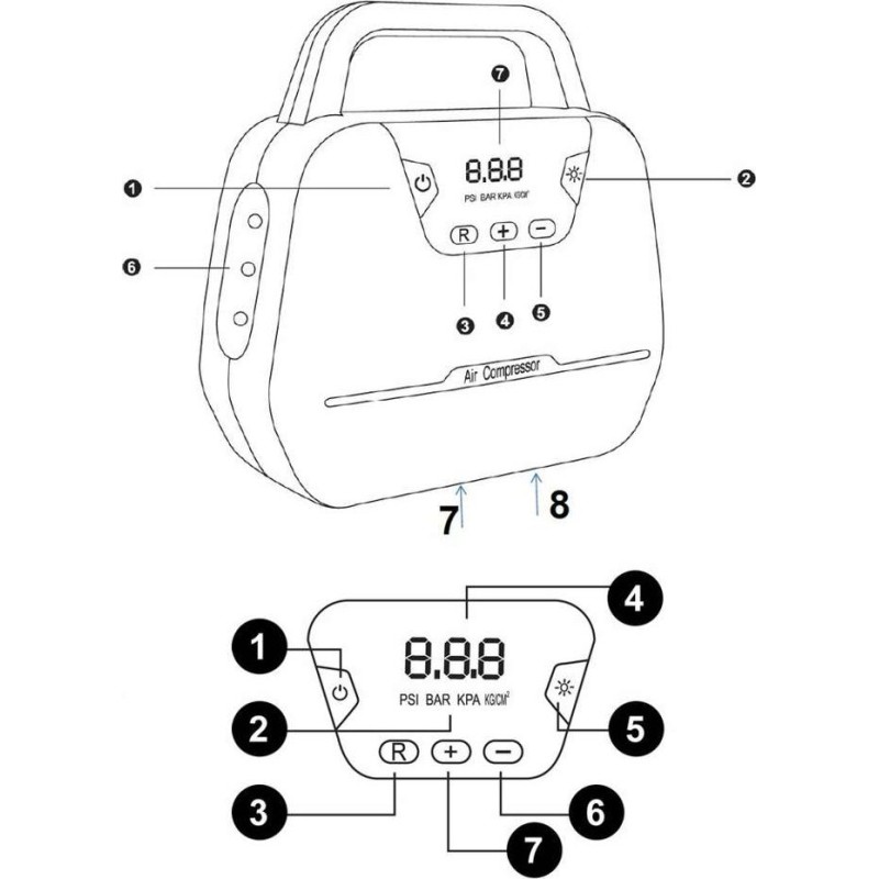 Schließen Sie den Kompressor an die Stromversorgung an, stellen Sie mit den Tasten „+“ und „-“ den gewünschten Druckwert ein, mit der Taste M können Sie die Einheit ändern (PSI / BAR / KPA / KG/CM3) – starten Sie den Kompressor mit der Taste auf der rechten Seite.