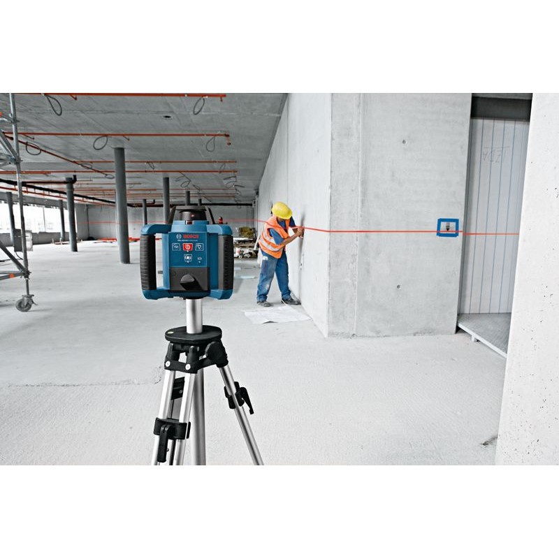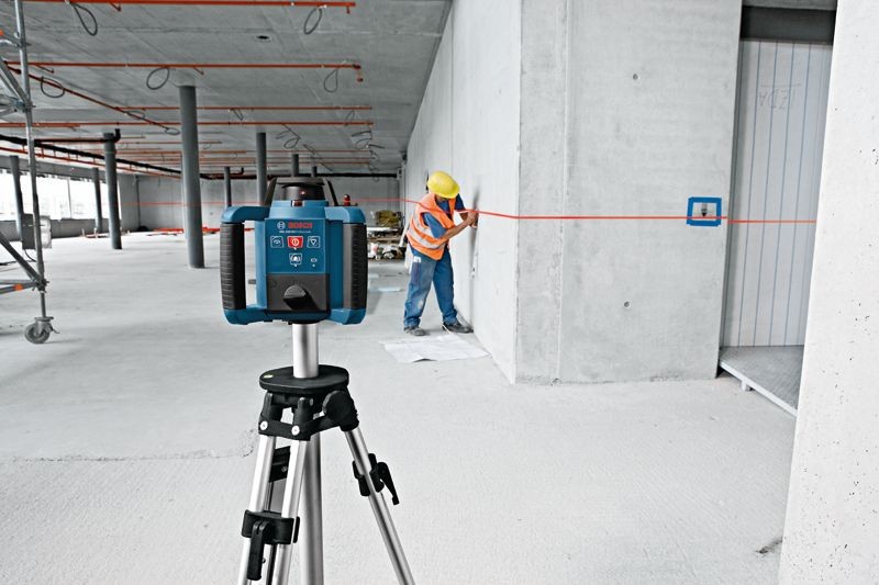 Rotierende Lasernivelliergeräte projizieren einen Lichtstrahl im Bereich von 360 Grad, sodass der Benutzer eine horizontale oder vertikale Ebene bestimmen kann. Tatsächlich handelt es sich bei diesem Lichtstrahl um einen einzelnen Lichtpunkt, der sich mit einer Geschwindigkeit zwischen 100 und 1100 Umdrehungen pro Minute drehen kann und so den Eindruck einer 360-Grad-Linie vermittelt. Der Lichtstrahl wird durch eine sogenannte Diode erzeugt, bei der es sich in diesem Fall einfach um einen Halbleiter handelt, der Licht erzeugt, wenn Strom durch ihn fließt.