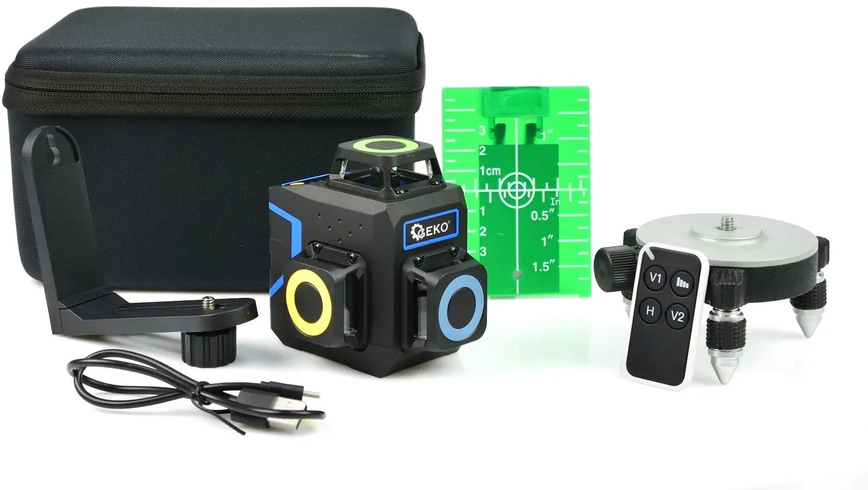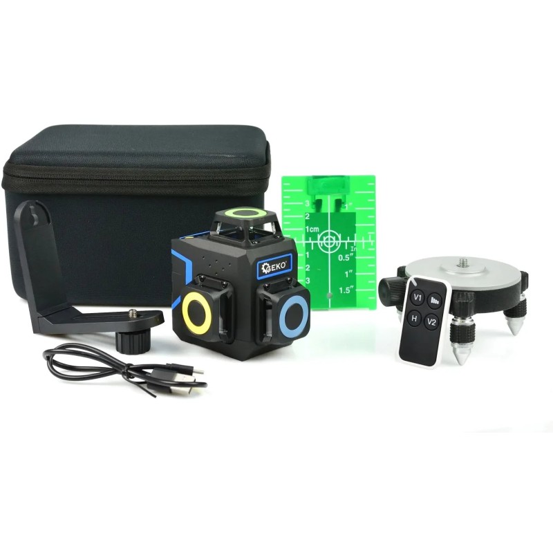 Im Lieferumfang enthalten sind ein drehbarer Ständer mit 3 verstellbaren Stützpunkten, eine Magnethalterung, eine Fernbedienung, ein Laserzielgerät sowie ein Ladekabel. Das Ganze ist in einem speziellen Koffer verpackt, der einen sicheren Transport und die Aufbewahrung des Geräts gewährleistet.