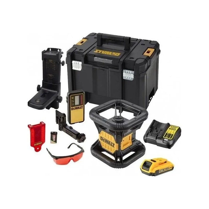 PROFESSIONELLER, AKKU-BETRIEBENER, SELBSTNIVELLIERENDER, UM 360° DREHBARER ROTLASER IM SET DCK374D1R: