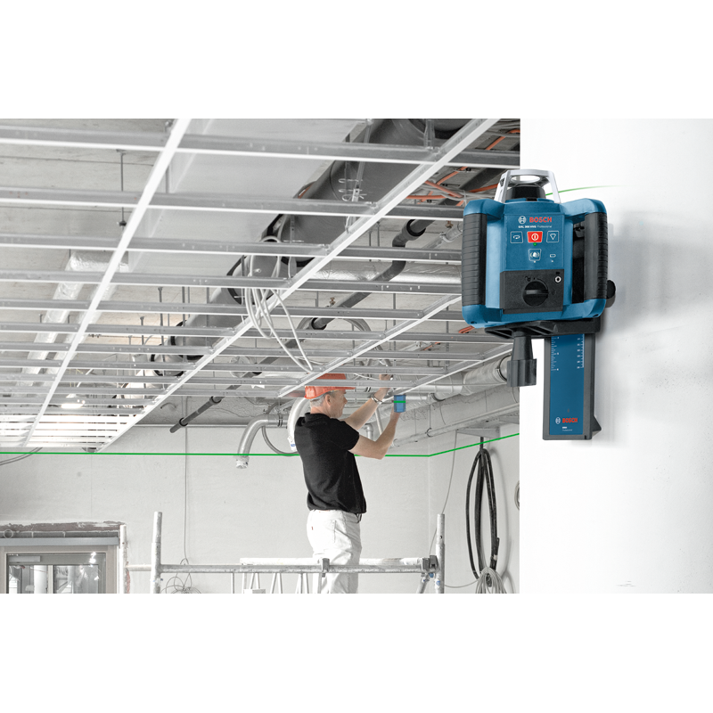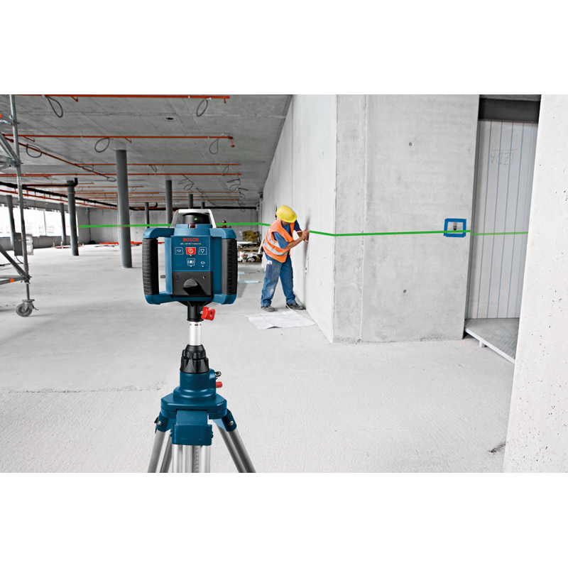 Rotierende Lasernivelliergeräte projizieren einen Lichtstrahl im Bereich von 360 Grad, sodass der Benutzer eine horizontale oder vertikale Ebene bestimmen kann. Tatsächlich handelt es sich bei diesem Lichtstrahl um einen einzelnen Lichtpunkt, der sich mit einer Geschwindigkeit zwischen 100 und 1100 Umdrehungen pro Minute drehen kann und so den Eindruck einer 360-Grad-Linie vermittelt. Der Lichtstrahl wird durch eine sogenannte Diode erzeugt, bei der es sich in diesem Fall einfach um einen Halbleiter handelt, der Licht erzeugt, wenn Strom durch ihn fließt.