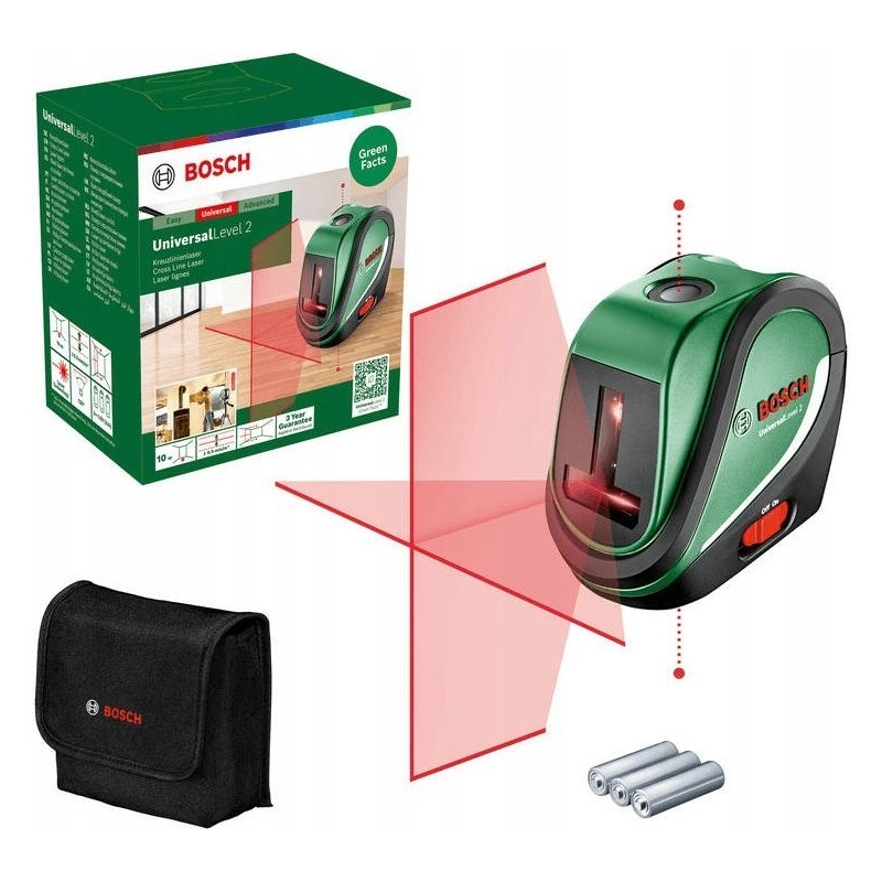 Dank der einfachen Bedienung, der Präzision und der hochwertigen, hellen Laserdioden erleichtert der UniversalLevel 2 die Ausführung von Ausbauarbeiten, die hohe Genauigkeit erfordern. Drei voreingestellte Modi (Kreuzlinien mit automatischer Nivellierung, Kreuzlinien und vertikale Punkte mit automatischer Nivellierung sowie Neigungsfunktion) ermöglichen das einfache Ausrichten von Elementen und das Übertragen von Punkten. Der Abstrahlwinkel von 120° ermöglicht die Projektion längerer Laserlinien und garantiert Genauigkeit auch bei geringen Entfernungen. Das Gerät verfügt außerdem über ein integriertes 1/4-Zoll-Gewinde zur Befestigung auf einem Stativ, bietet eine Nivelliergenauigkeit von ±0,5 mm/m und eine maximale Reichweite von 10 m. Es eignet sich ideal zum Aufhängen von Bildern oder Regalen, zum Tapezieren, zum Anbringen von Leuchten sowie zum Installieren von Geländern und Gardinenstangen.