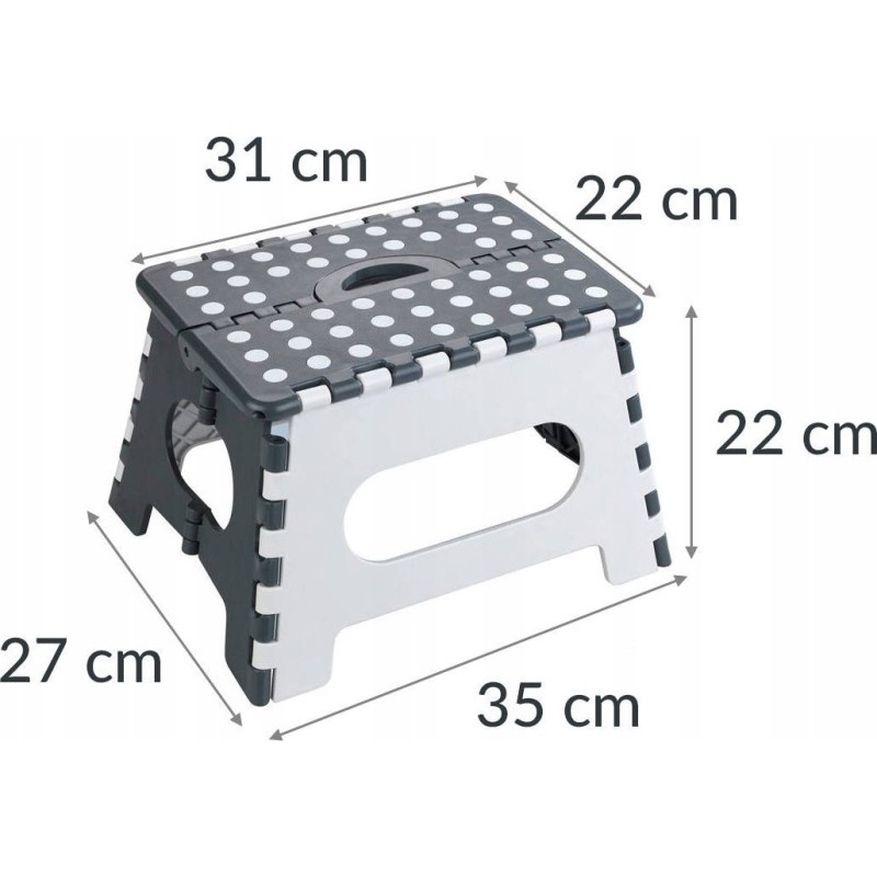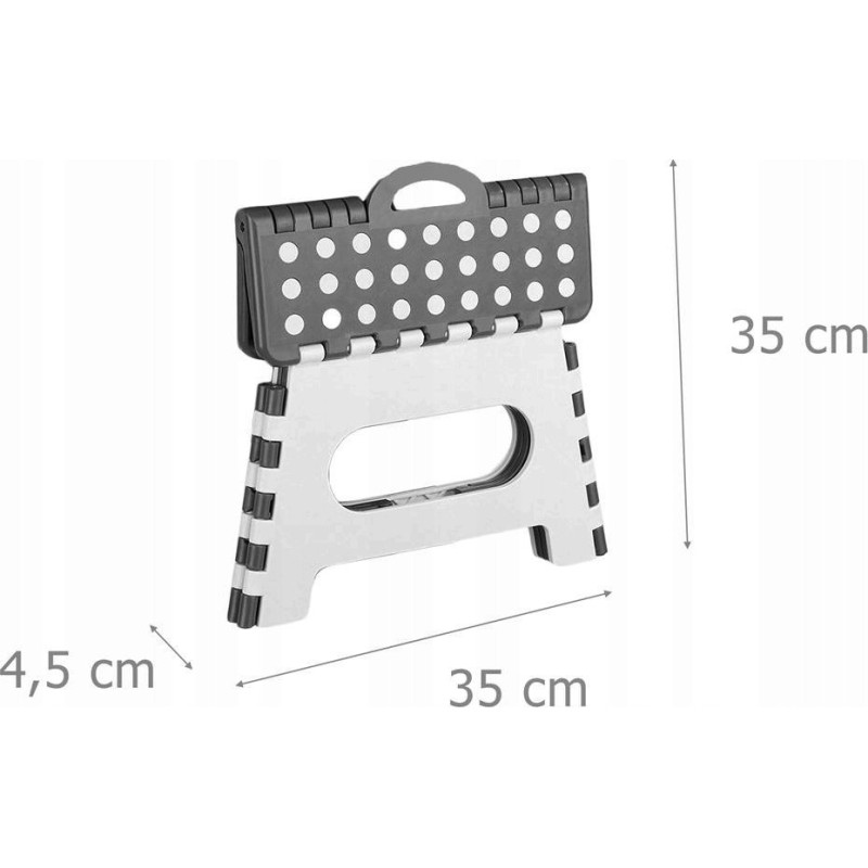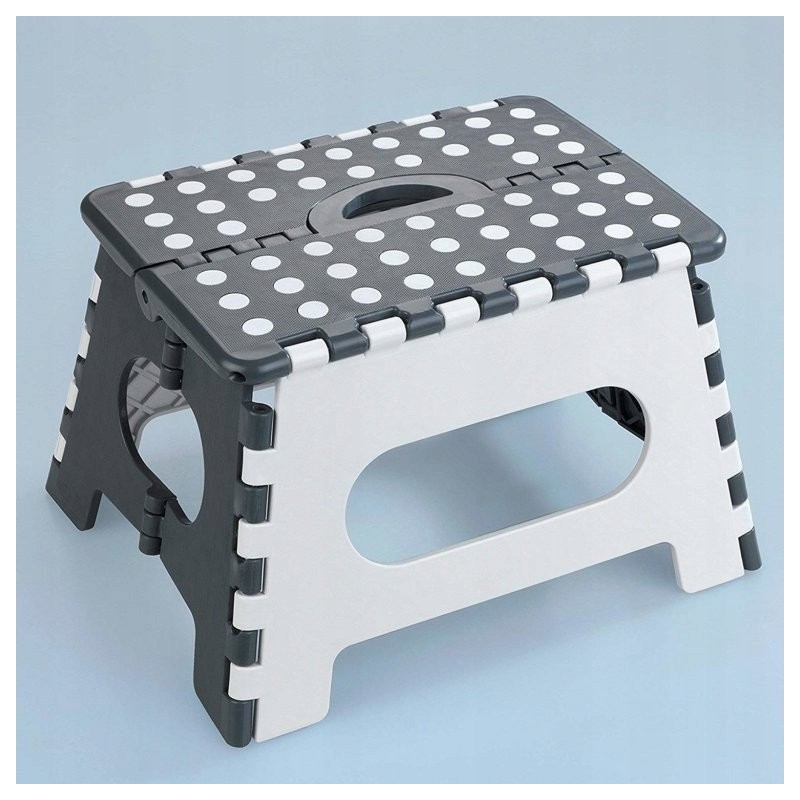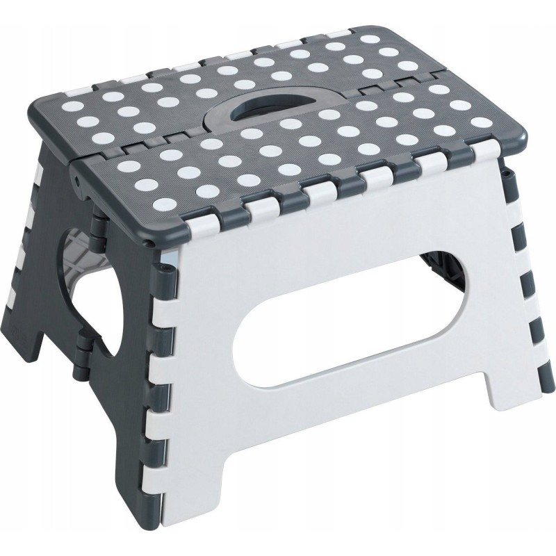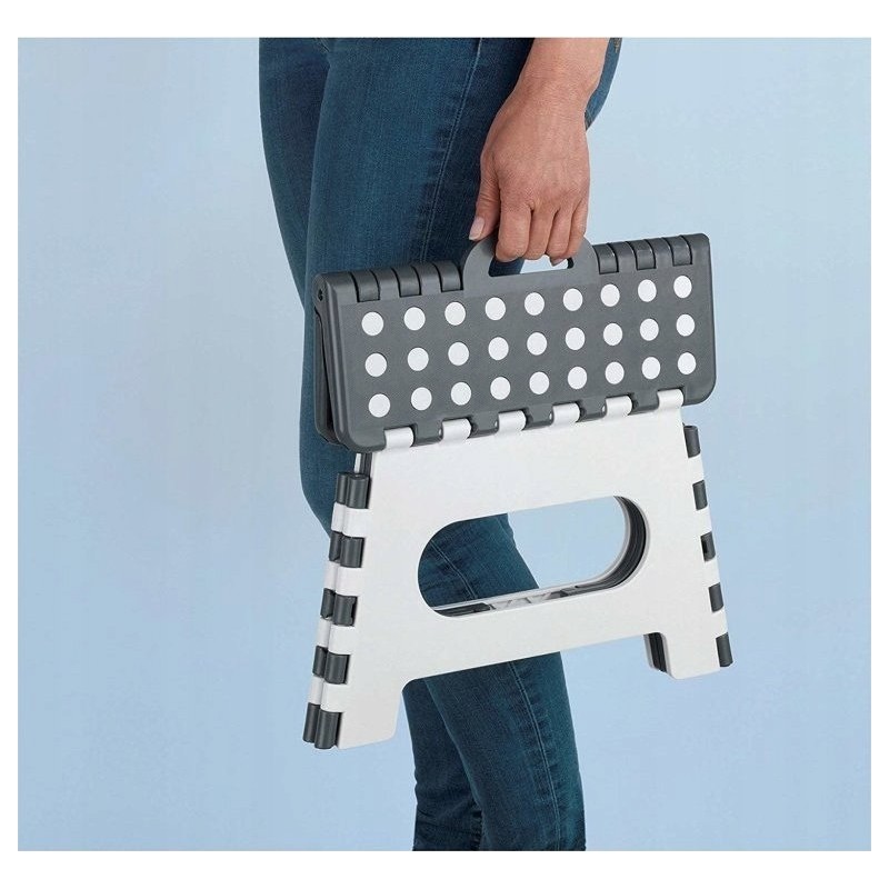 Zusammengeklappt nimmt der Hocker dank seines Klappmechanismus nur wenig Platz ein. Er lässt sich daher leicht transportieren und verstauen. Er ist mit einem Griff ausgestattet, der das Tragen an jeden beliebigen Ort erleichtert.
