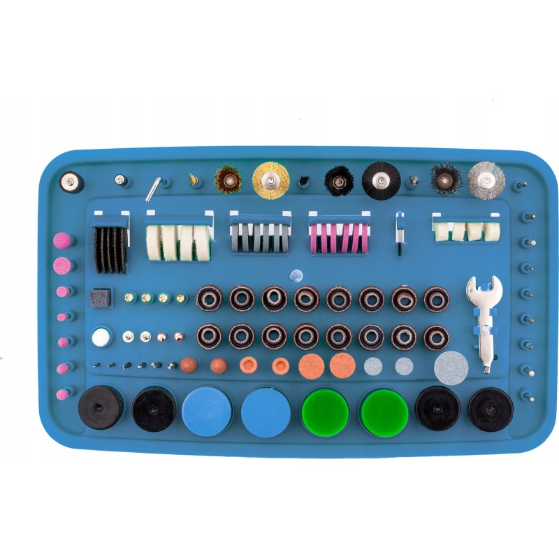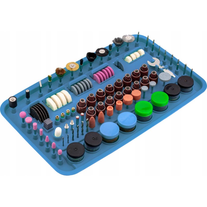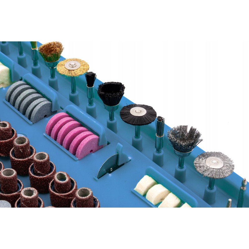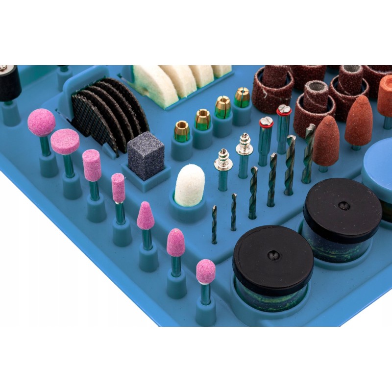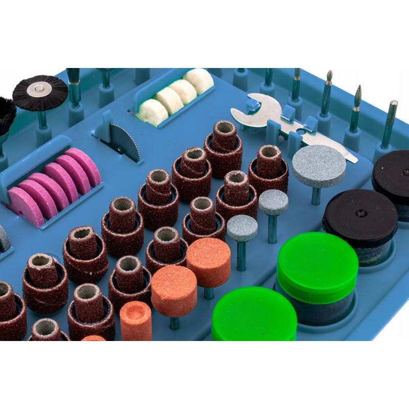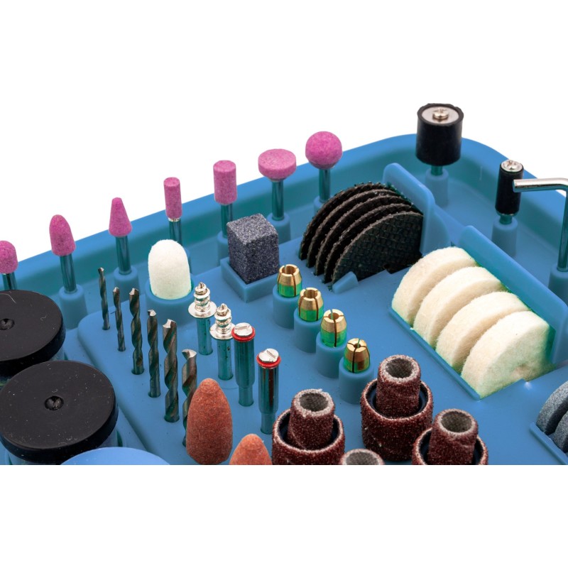 Mikroschleifer mit komplettem Zubehörset Das Gerät ist mit einem 170-W-Elektromotor ausgestattet, dessen Drehzahl stufenlos im Bereich von 8000 bis 35000 U/min reguliert werden kann.