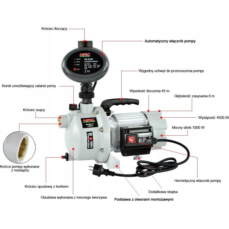 Die Pumpe findet Anwendung im Haushalt und ist ein unverzichtbares Gerät für Kleingärtner. Sie verfügt über einen sehr leistungsstarken 1000-W-Motor, der eine Förderleistung von 4500 Litern/Stunde und einen Betriebsdruck von bis zu 2,8 bar ermöglicht. Die maximale Förderhöhe beträgt 45 Meter und die maximale Ansaugtiefe 8 Meter.