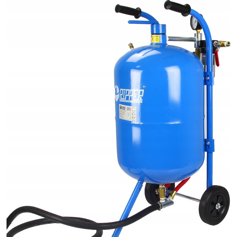 Die Sandstrahlmaschine ist mit Gummirädern für den Transport sowie praktischen Griffen ausgestattet, die das Bewegen erleichtern und den Arbeitskomfort des Bedieners erhöhen.
