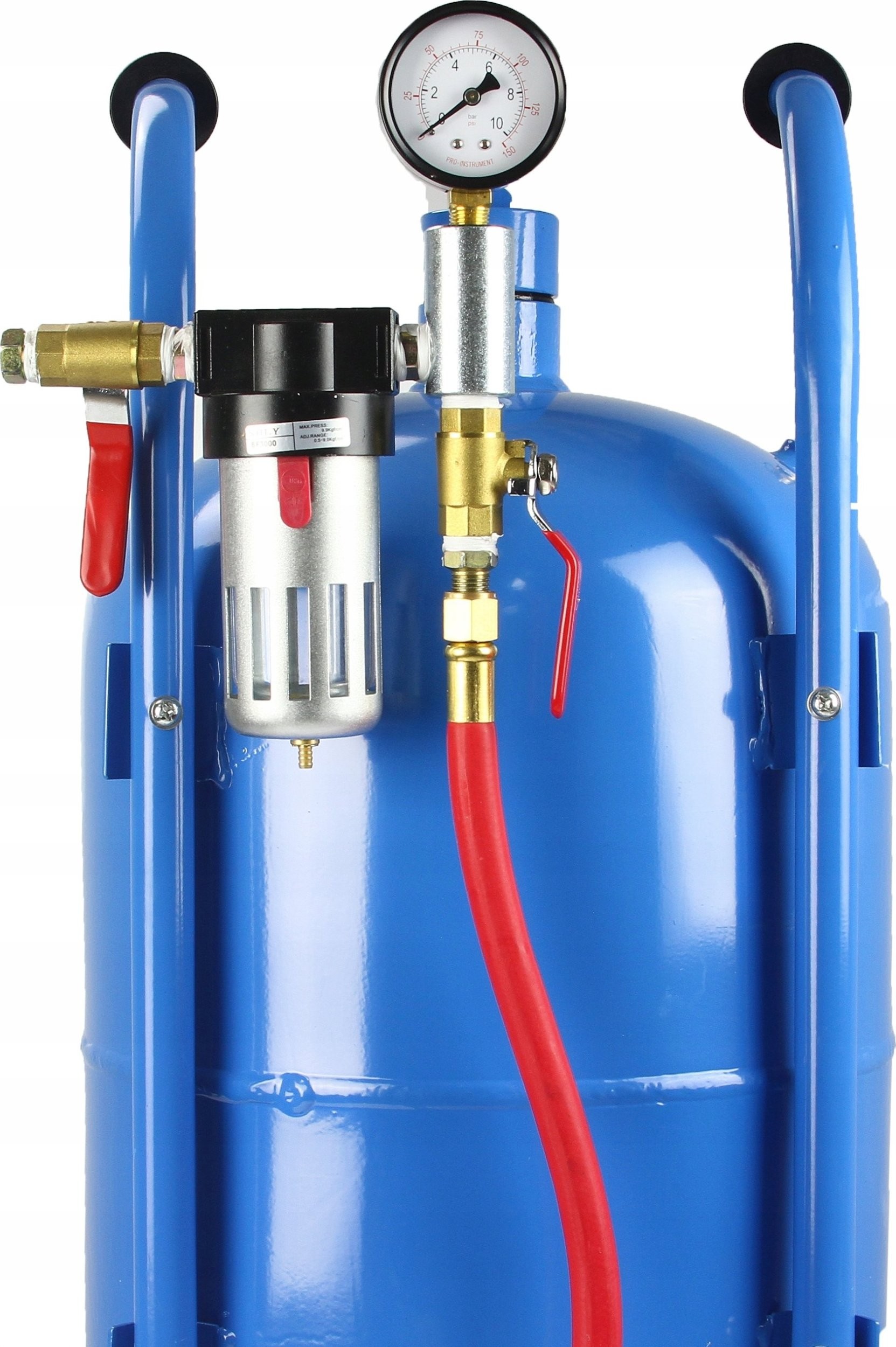 Am Ende des Einlassschlauchs des Sandstrahlers befindet sich oben am Behälter gut sichtbar ein Manometer mit Wasserabscheider.