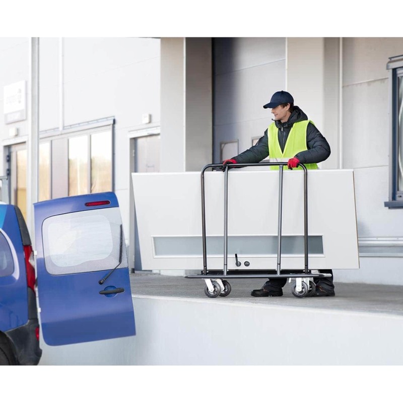eignet sich ideal für Lager, Möbelgeschäfte, Großhandelsbetriebe oder Baustellen. Er ist hervorragend für den Transport von Gipskartonplatten, Brettern, Wandverkleidungen, Möbeln, Paketen usw. geeignet. Er zeichnet sich durch eine offene, einfache Konstruktion