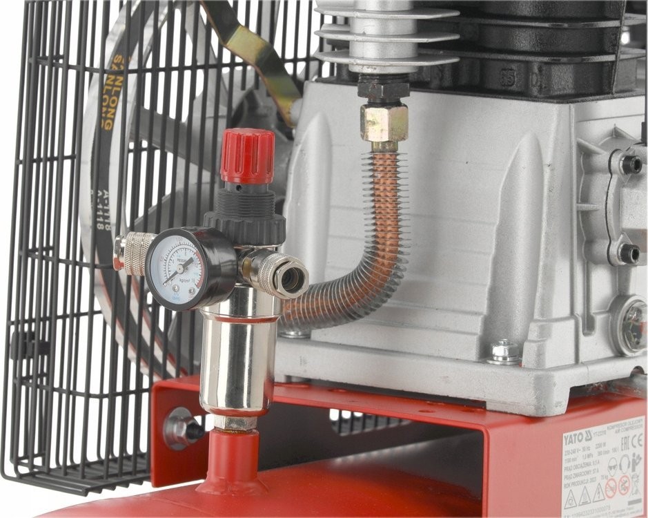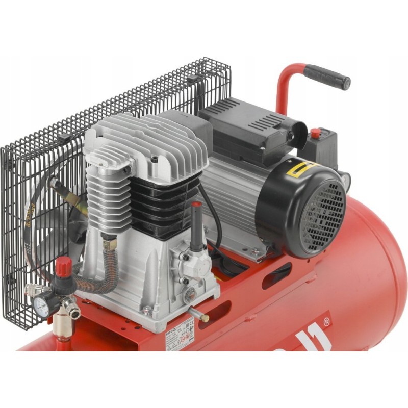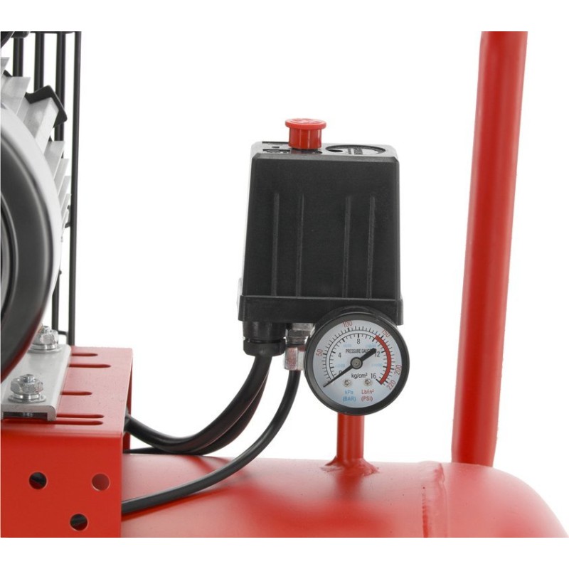 Ölkompressor mit zwei Anschlüssen und Druckregelung. Er eignet sich ideal zur Versorgung von Geräten mit Druckluft, zum Ausblasen von Öffnungen und zur Oberflächenreinigung. Er ist eine unverzichtbare Hilfe in der Industrie, auf der Baustelle, in der Werkstatt und auf dem Land.